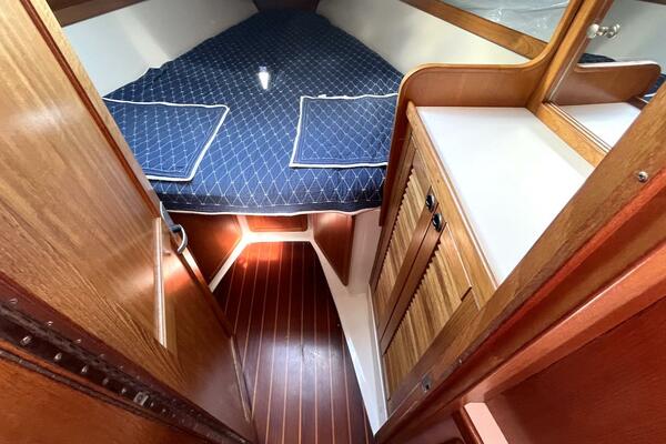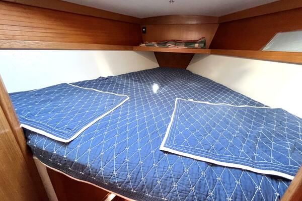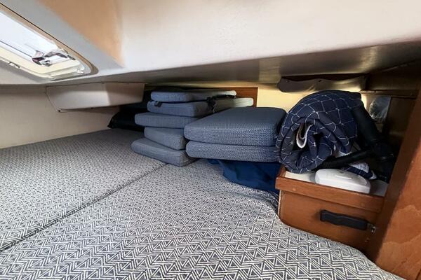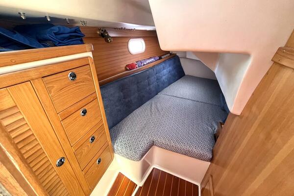 The private forward cabin offers a roomy V-berth with custom cushions, hanging locker, overhead hatch for ventilation, and ample storage. The aft cabin, tucked beneath the cockpit, is a standout feature: a spacious athwartship double berth with an overhead hatch to the cockpit and another hanging locker—providing comfortable and private sleeping quarters for two adults.