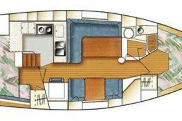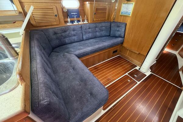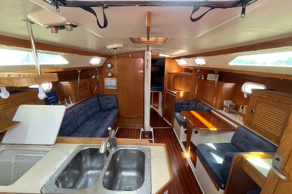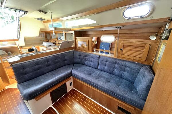 At 36 feet, she offers spacious accommodations rarely found in boats her size. Step below deck and you'll be greeted by a warm, teak-finished interior with a generous salon, a well-equipped galley, and two private staterooms—ideal for family cruising or hosting friends. The L-shaped dinette easily converts into an additional berth, allowing for flexible sleeping arrangements for up to seven people. The settee on starboard can convert to a table and 2 chairs for couples cruising.