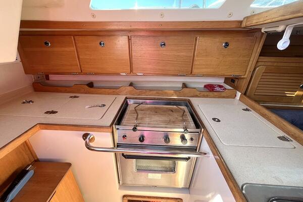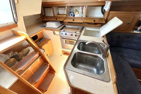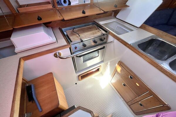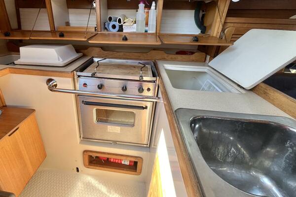 The galley is intelligently laid out for safe and convenient meal prep at sea, featuring a two-burner propane stove with oven, deep double stainless steel sink, top-loading refrigerator/freezer, and plentiful counter and storage space.