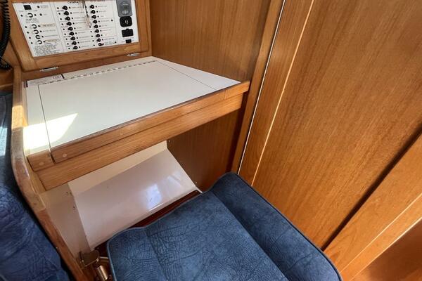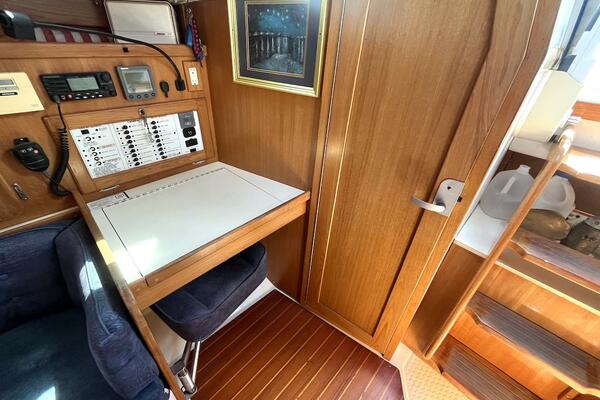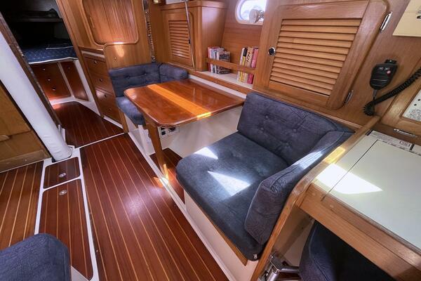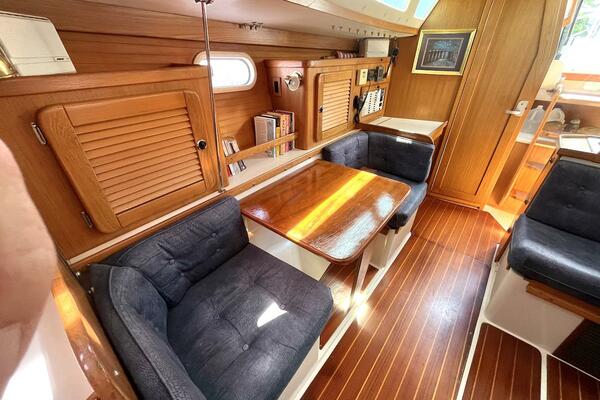 Below deck, you'll find a bright, warm interior finished in rich teak cabinetry, molded fiberglass headliner, and generous natural light from multiple hatches and ports. The main salon features a large L-shaped dinette to port, which converts into a double berth, and a long settee to starboard that converts to a table and 2 chairs—creating a social, open space ideal for entertaining or relaxing after a day under sail. The Navigation station to port has a spring fold-away stool for comfort and convenience.