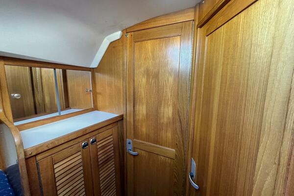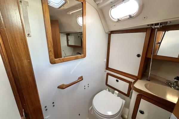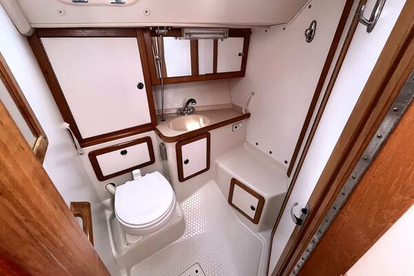Next to the forward cabin is a generously sized head with a marine toilet, seperate shower, and vanity sink—accessible from both the salon and forward cabin for added privacy.