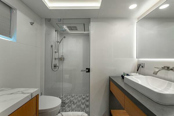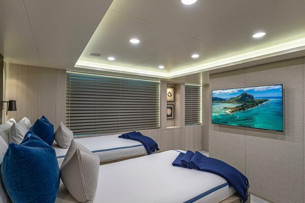 Descending the central staircase to the lower deck you will find the additional four staterooms, each with king-size beds and luxurious bedding, top-tier entertainment systems, and unique decor. Two of the suites are convertible to twin staterooms to suit any guests needs. Central to these staterooms you will find a convenient pantry, offering an array of refreshments. Also on the lower deck are the crew quarters, room for 12 and privately situated as to not disturb guests.