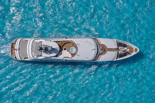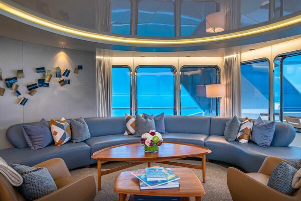 Retreat up to the sky lounge for an oasis of sophistication complimented by stunning panoramic ocean views while relaxing on the crescent-shaped sofa or sitting at the games table. Out on the upper aft deck, experience a spacious area perfect for lounging and dining al fresco. A large dining table makes this an ideal spot for any occasion, from causal gatherings to elegant events. Or spend some time on the forward bridge deck in a quiet space with cozy seating. Nearby, on the starboard side deck, a shaded gym and spa make this spot a great place for peace, privacy, and relaxation.