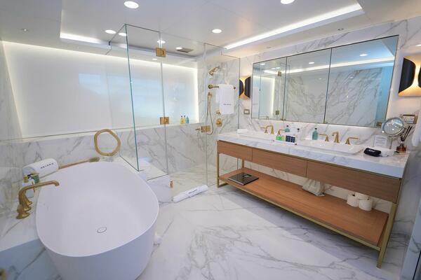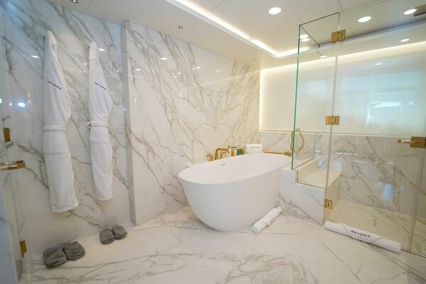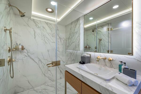Continuing forward on the main deck, the full beam owner’s stateroom is a sanctuary of comfort and style. It includes a king bed, seating area, private study, and large marble ensuite featuring his-and-hers sinks with gold bathroom fixtures and a plunge tub. Adjacent to the owner’s suite is the VIP stateroom, with a walk-around queen bed and private ensuite.