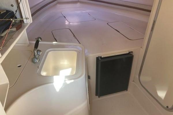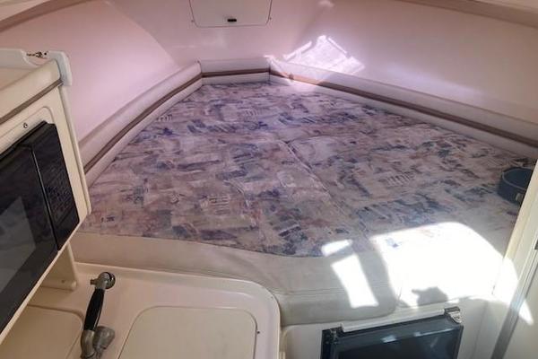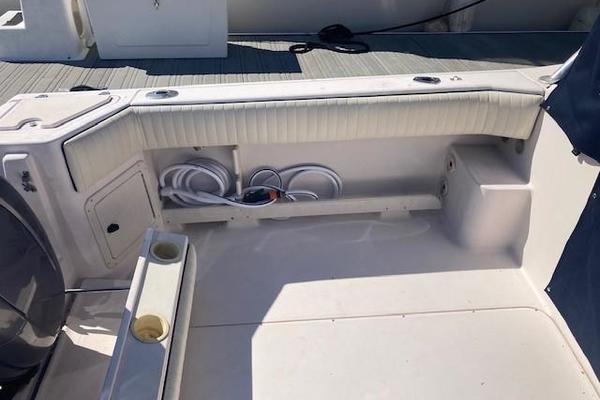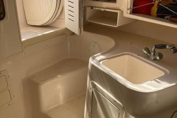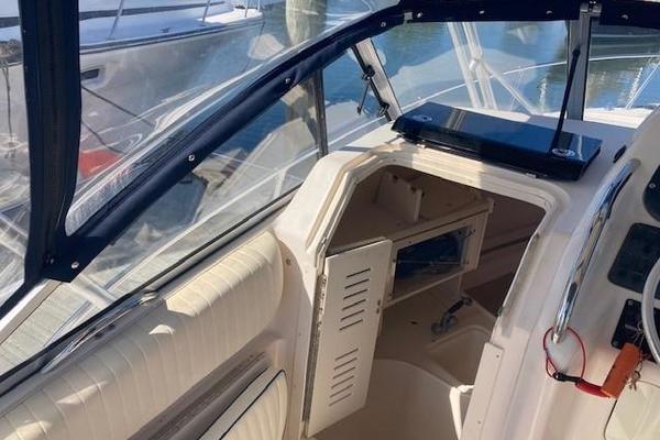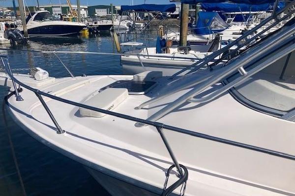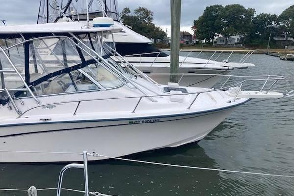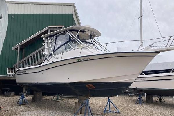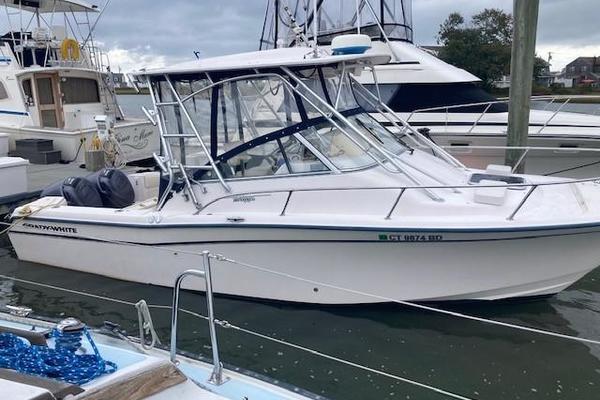 A good-looking, popular model the Grady White 265 White Express has lots of room when it comes to cockpit, bridgedeck and cabin space. The wide 9'7" beam is unusual for a 26 footer.. Built on a solid fiberglass hull, her features include a factory hardtop, rigging station with sink, deluxe captain's chair, raw water washdown, aft-facing cockpit seats, large insulated fishbox, 40 gal standup ivewell, cockpit toe rails and a fold-down motorwell bulkhead. Below deck the surprisingly spacious cabin sleeps two in a wide double berth, galley with microwave and a refrigerator and there's an enclosed head with marine head w/holding tank.