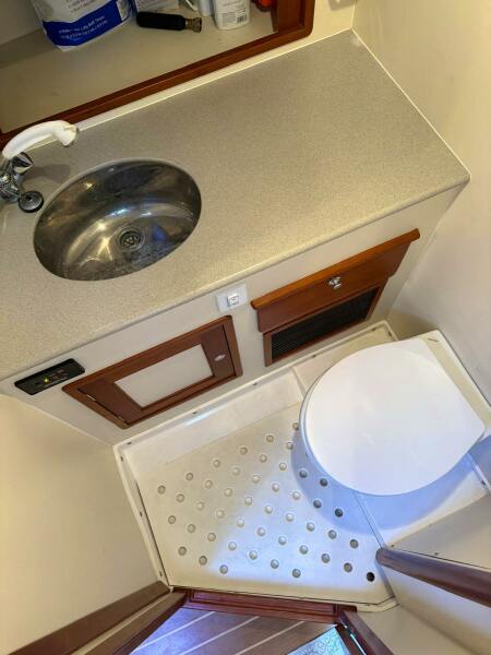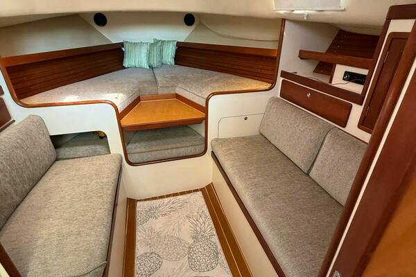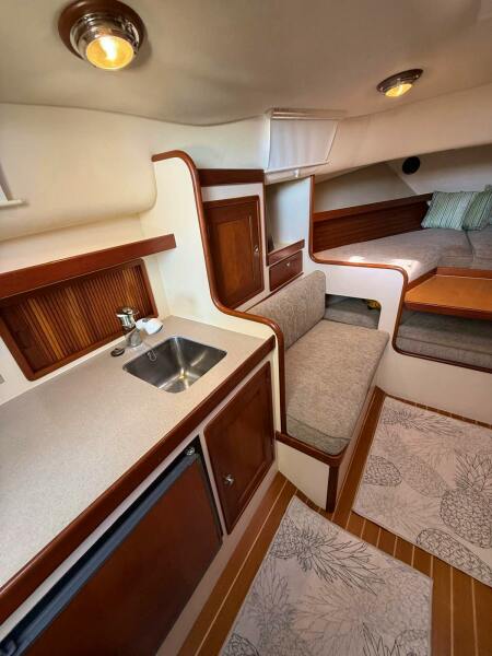 "LARK” is a comfortable cruiser with a full-beam berth in the bow that will sleep two comfortably. The salon/galley/head is well-outfitted as far as soft goods. The boat has a full set of stylish exterior and interior cushions that are in wonderful shape. Aft of the berth are bench style settees that face one another. The head is to starboard contains a large sink, electric head, and a wet-head style shower. All compartments below and at the helm are air conditioned.SALON
