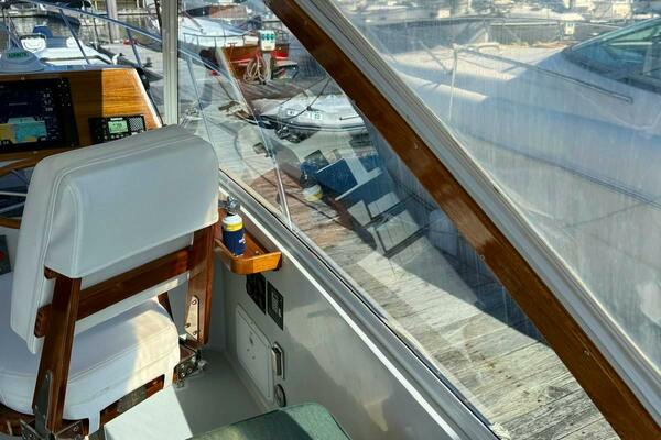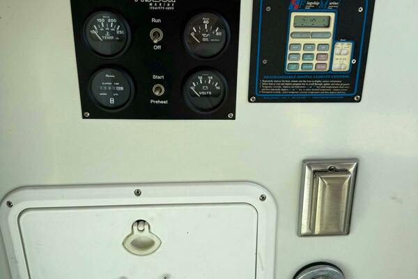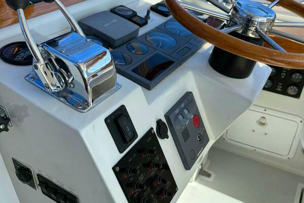 LARKs helm is offset to starboard and offers a stunning view of the full exterior. To port is a captain's chair that matches the operators. Behind the co-pilot station, which has its own map table, is an L-shaped settee that has a full set of cushions. In the middle of the non-skid bridge deck is engine room access via hatch or by electronic lift. Lights are throughout the bridge with well-marked switches located left of the helm. Located to starboard behind the helm, is a compartment that houses an onboard Norcold cooler/freezerINSTRUMENTS/ELECTRONICS