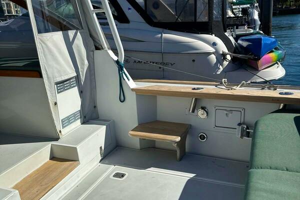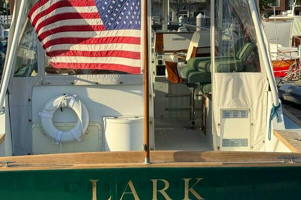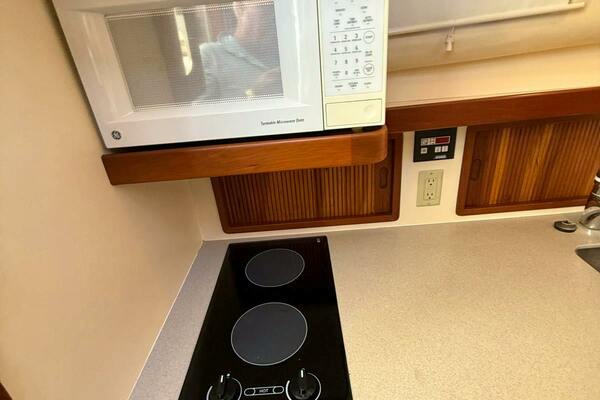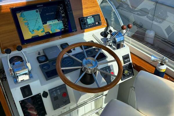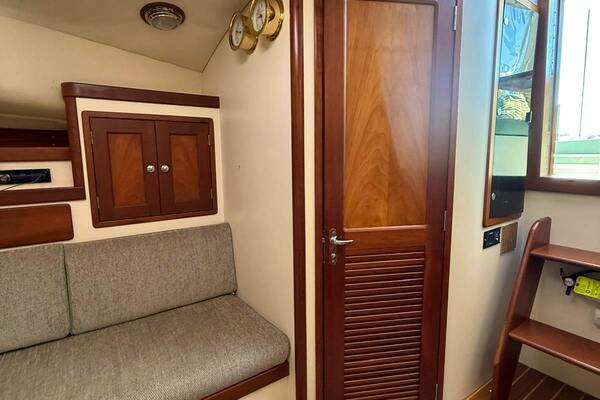 Boarding from the swim platform, or from either side of the stern, you step down into a very spacious and comfortable cockpit that has a complete set of cushions. Like the rest of the boat inside and out, the cockpit is trimmed with warm hued satin teak brightwork. At night the boat has eye-popping courtesy lights throughout the exterior and cockpit. Going forward via the side decks, you have plenty of room to catch/throw a line or stand alongside in a lock. The foredeck is very open, and with its size could be easily utilized to soak up some sun underway or at the dock. A step up from the rear cockpit brings you to the bridge/helm area. Originally outfitted with a helm chair only to starboard at the helm, a matching captain's chair was added to port on the settee. It can be easily removed and the cushions added to the settee for entertaining. The starboard-offset helm has a command view of the boat from stem to stern and is laid out efficiently for ease of operation. To port, adjacent to the companionway door, is a beautiful teak chart table that could also be used as a serving table for a quick lunch underway. Heading down the teak companionway stairs, you enter the spacious and uncluttered living quarters. Offset to port is the galley complete with electric burners, stainless basin sink, a generous refrigerator, and a microwave. To starboard is the wet head, which has an electric head. Forward of the head and galley, are mirror-image bench settees both port and starboard with storage behind them on the bulkheads. In the bow is the berth, which is full-beam and comfortable with full cushions port, starboard, and the center filler. Overhead of the berth is the forward hatch leading to the foredeck.ACCOMMODATIONS
