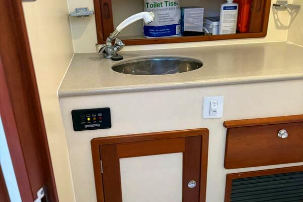 The salon on this Little Harbor is small but pleasant. Surrounded with warm teak and cushions, the hangout part of the salon is comfortable and offers ample space for storage of personal items or safety gear for captain/crew. You’ll find:- Overhead lighting