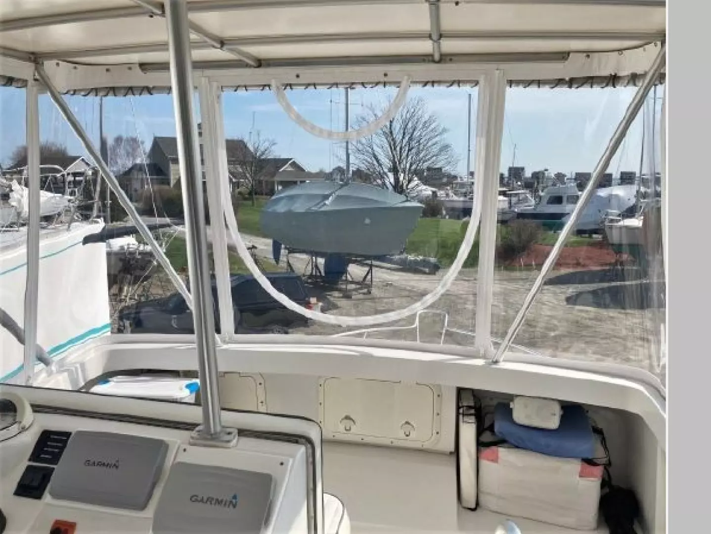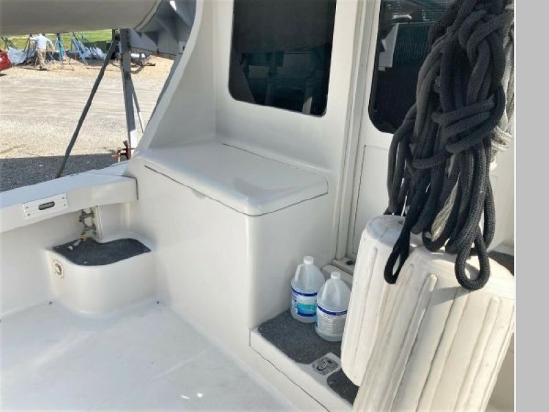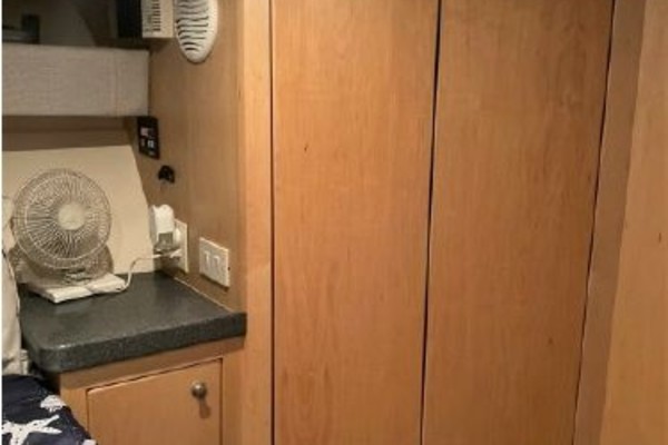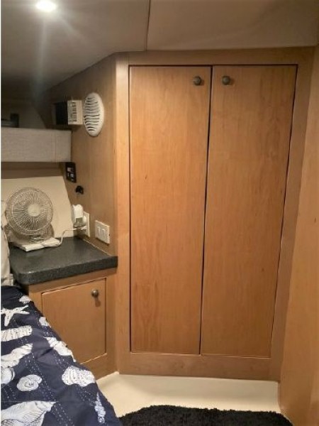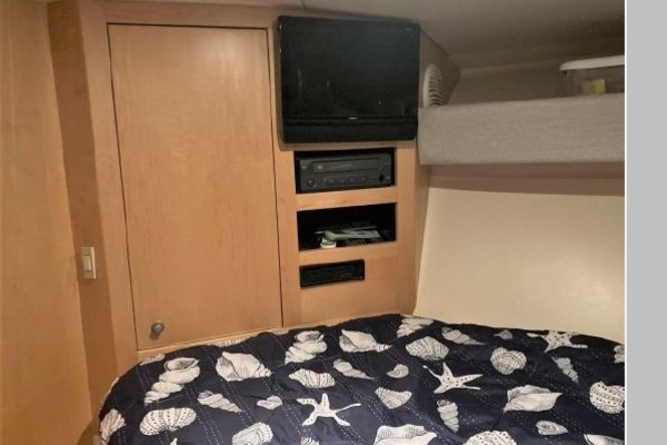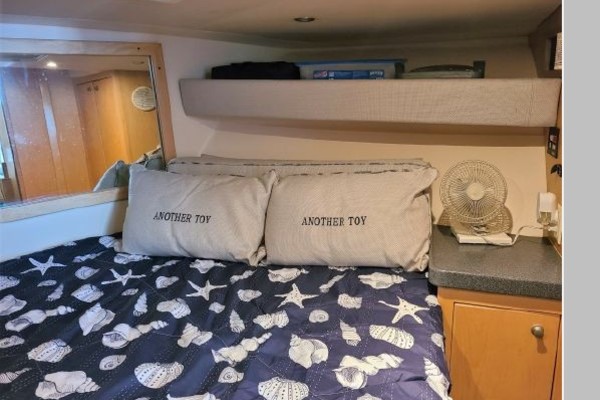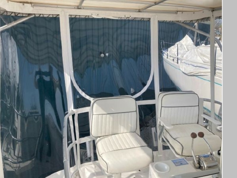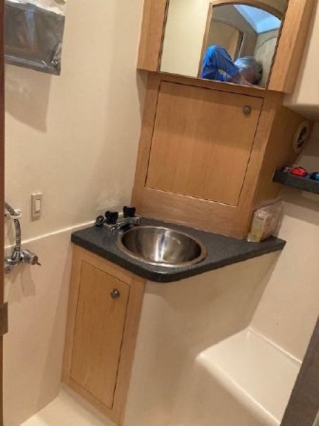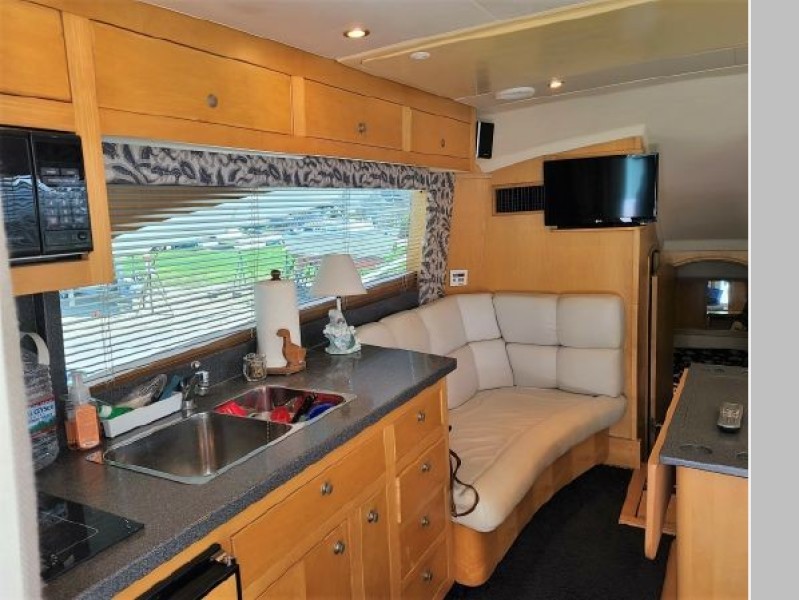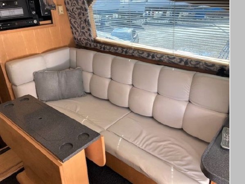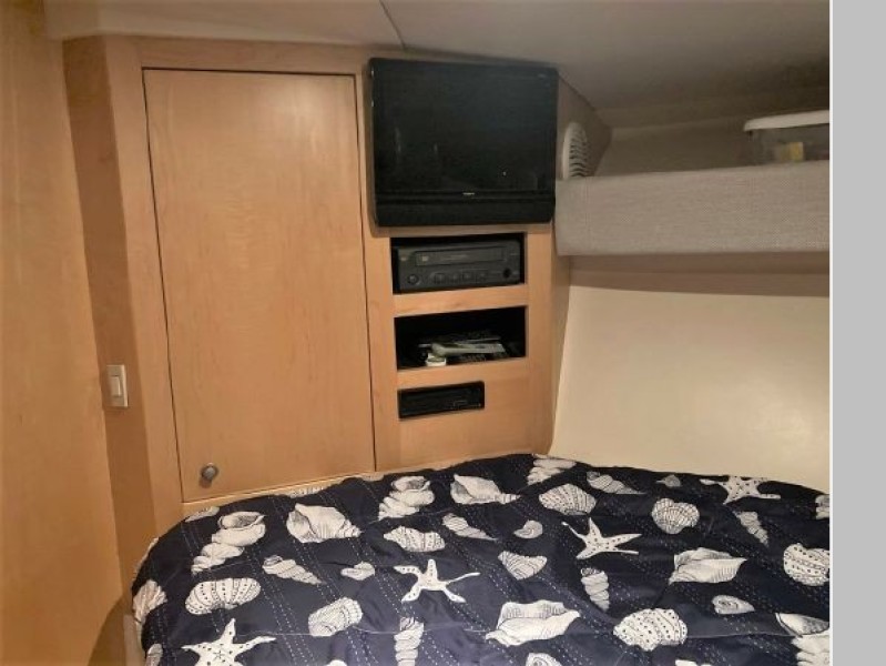 Attractive teak interior with carpeting. Private forward stateroom has a double bed with innerspring mattress, storage under plus two hanging lockers. The starboard-side head compartment has a vanity w/Corian countertop electric toilet and storage compartments. An unusual practical feature for a boat of this size is the shower is located in a separate compartment on the port-side. The salon has windows on three sides, the galley, a port-side bench seat and a starboard-side settee that pulls out to become a double berth and the back swings up to become a small additional berth. In front of the settee is a drop leaf dining table and there is a wall mounted TV w/DVD plus an AM/FM/CD stereo