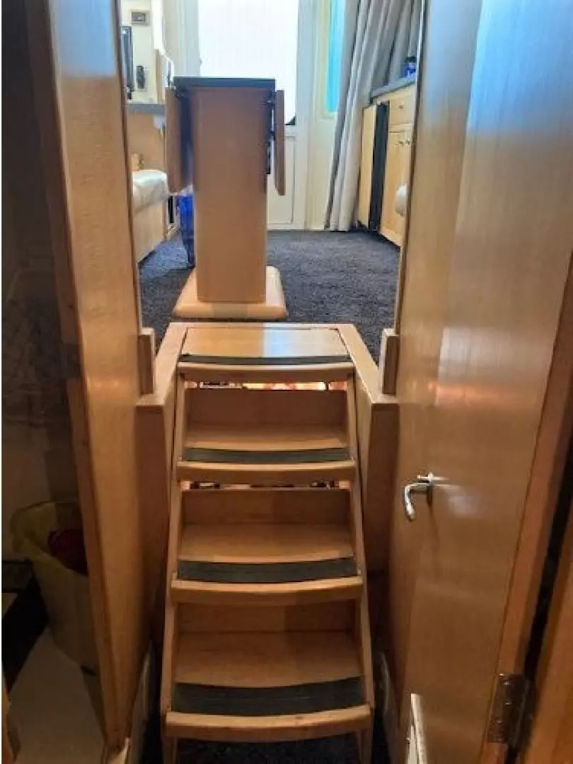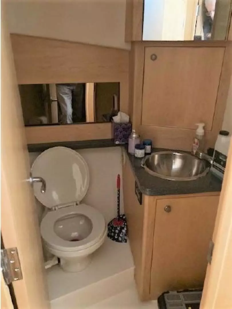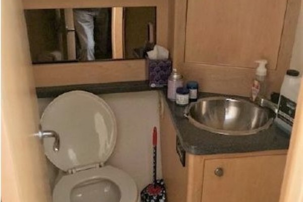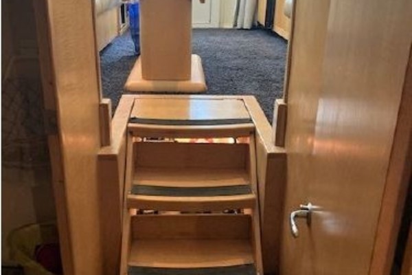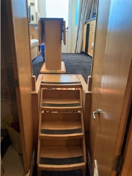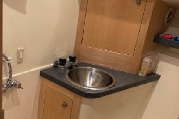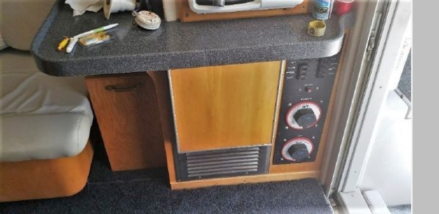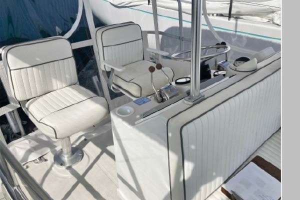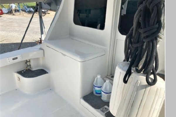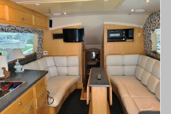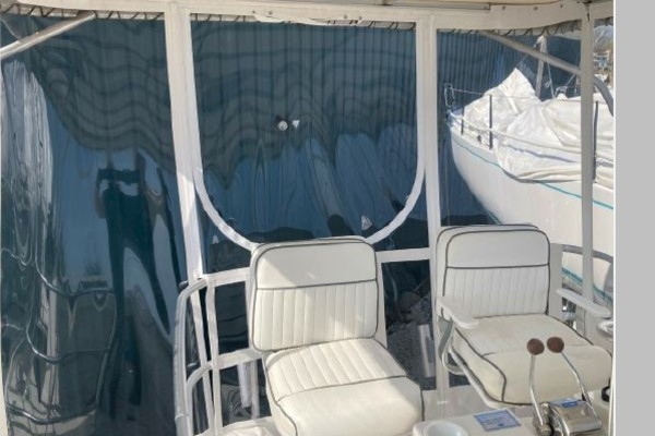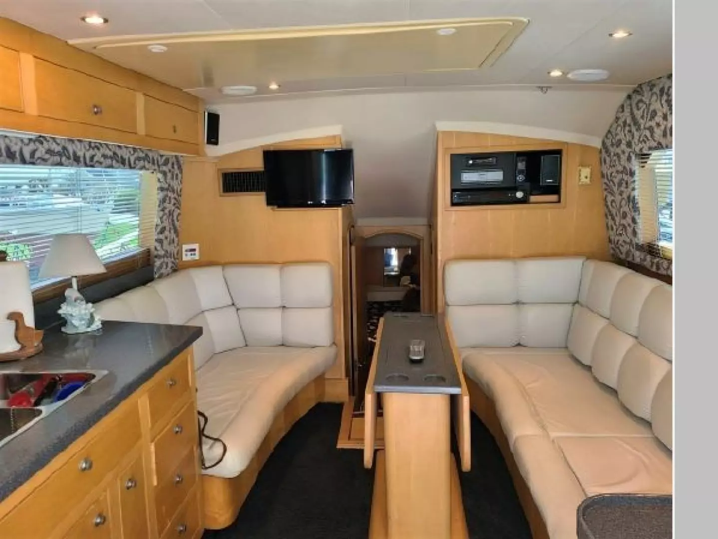 Attractive teak interior with carpeting. Private forward stateroom has a double bed with innerspring mattress, storage under plus two hanging lockers. The starboard-side head compartment has a vanity w/Corian countertop electric toilet and storage compartments. An unusual practical feature for a boat of this size is the shower is located in a separate compartment on the port-side. The salon has windows on three sides, the galley, a port-side bench seat and a starboard-side settee that pulls out to become a double berth and the back swings up to become a small additional berth. In front of the settee is a drop leaf dining table and there is a wall mounted TV w/DVD plus an AM/FM/CD stereo