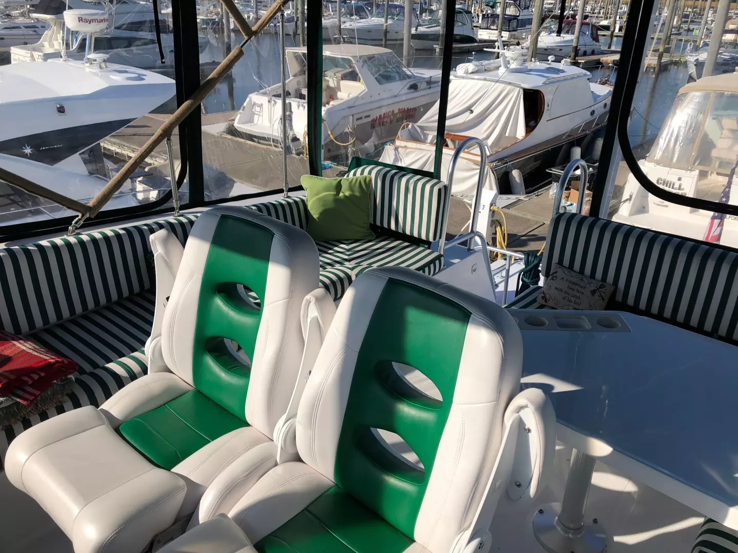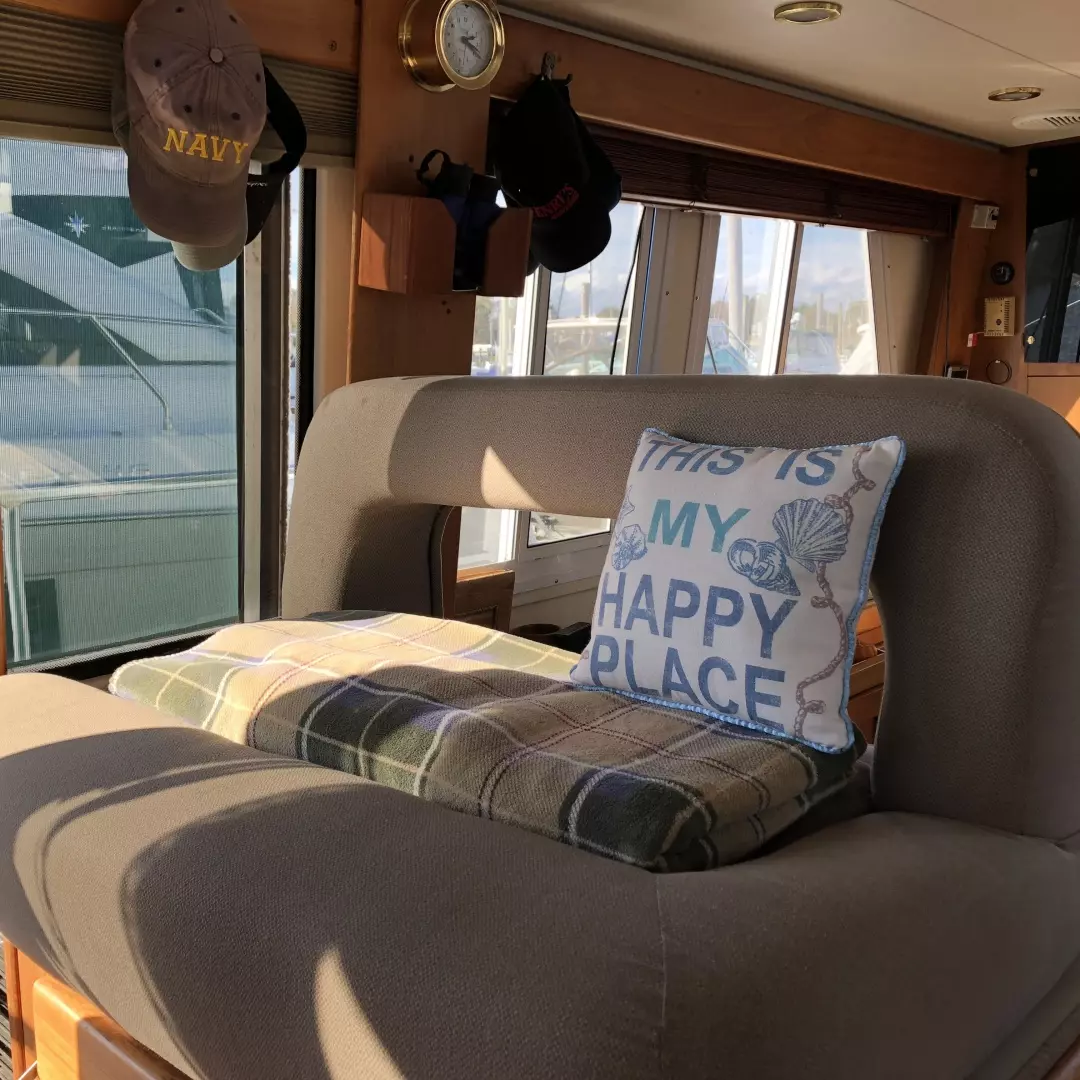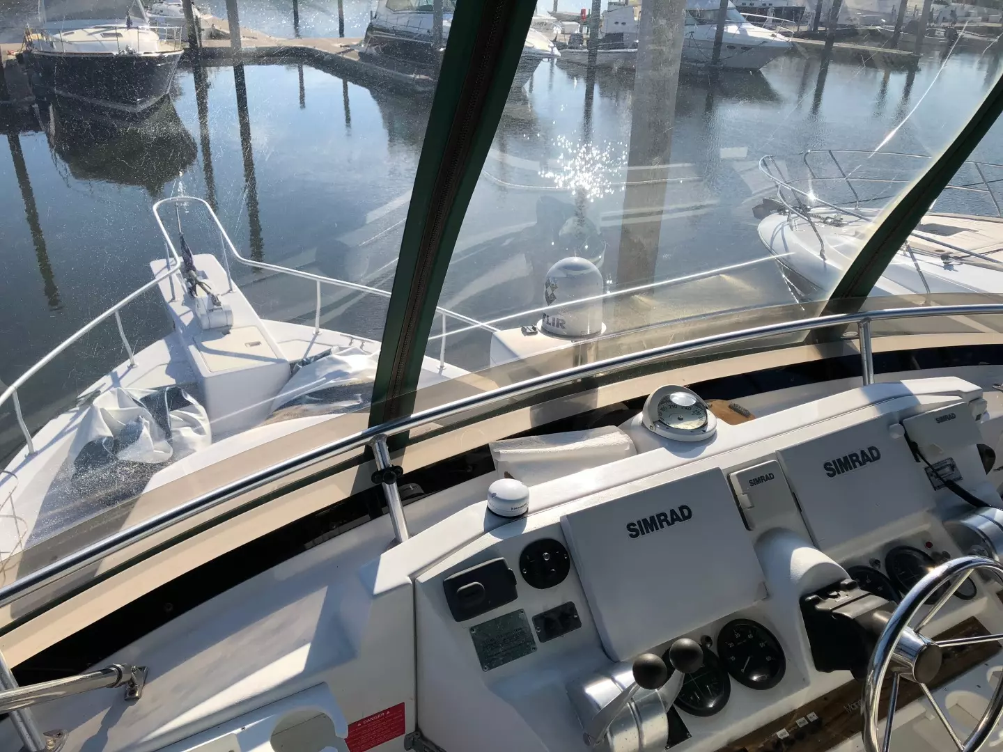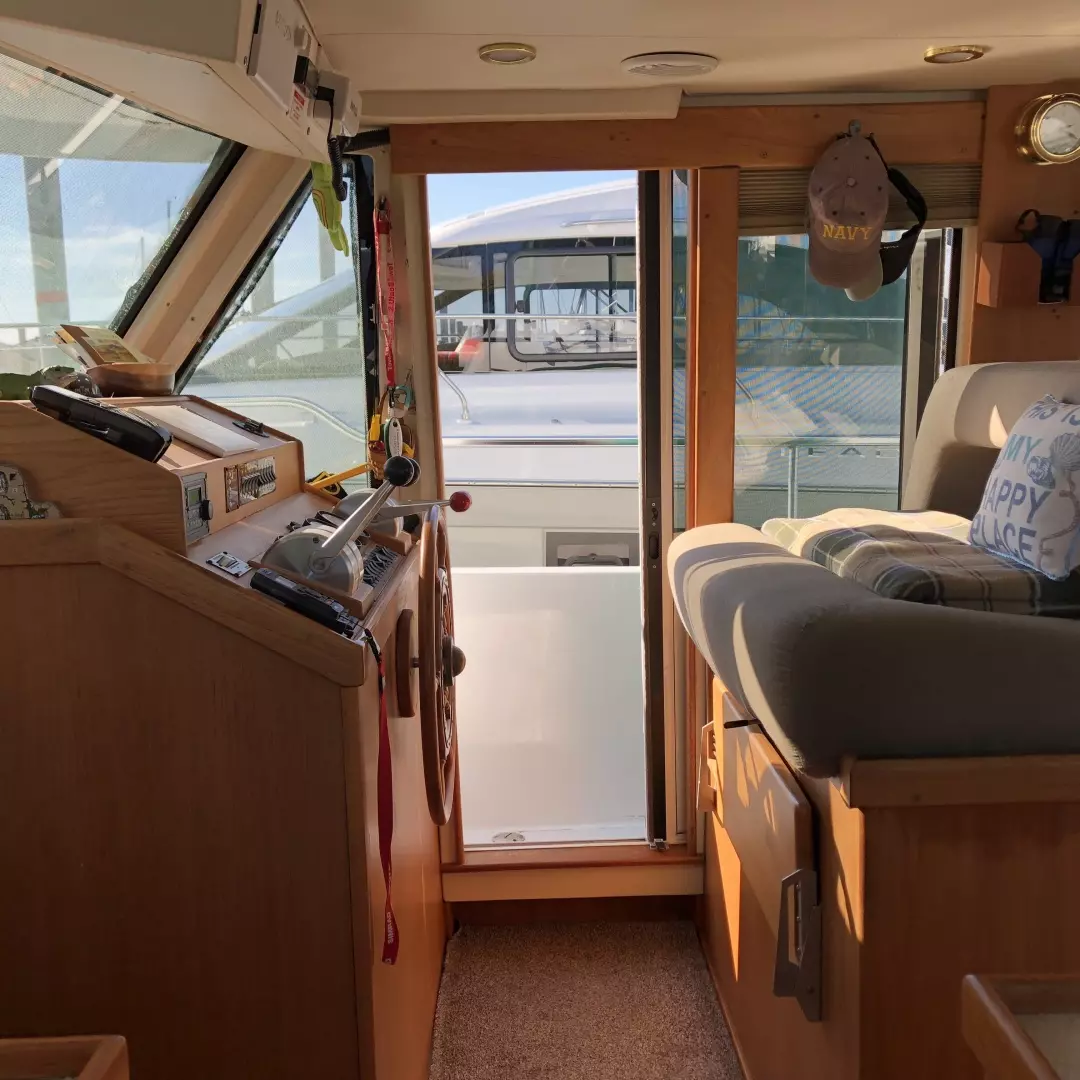 Mary Jean a Mainship 430 three stateroom layout with galley up powered by a pair of Caterpillar 3116 TAS 350 HP diesel motors is well maintained by its owners. This cruising yacht with tradional trawler stying has an updated Simrad Marine electtonics package, a Marquip davit system for the RIB inflatable tender and ouboard. The 430 is known for its spacious interior with plenty of storage the main stateroom is aft with an island queen berth that has rear cockpit access, forward the main salon with four person dining table to port a desk and entertainment center with chair to starboard. The well equipped galley is to port with under the counter Vitrifigo 2 drawer refrigertor a second guest stateroom extends under the galley sole and the V berth is forward. Teak cabinetry through out with teak and holly flooring in the salon and galley with LED lighting including valence lighting on both sides of the salon all on dimmers