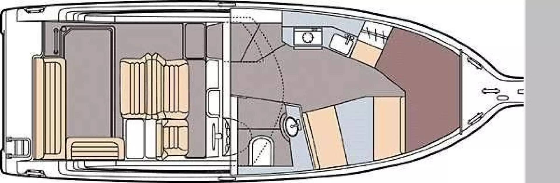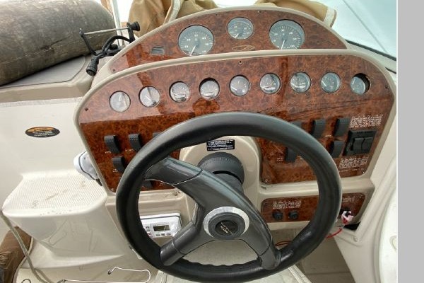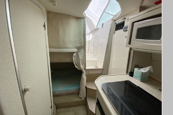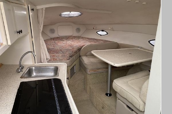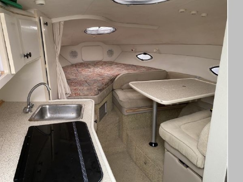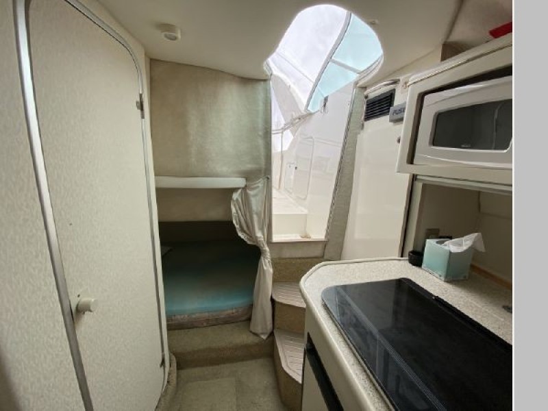 The Maxum 2800 SCR helm includes a burl grain instrument panel, a VHF radio, a depth finder, and a Danforth compass. The cockpit lounge features a cooler and a removable table, while distinctive elliptical portlights invite the sun and breezes into the main cabin. Molded cabin entry with sliding cap provides easy access to the bright and airy cabin. The radar arch adds function to style with lighting and sound system speakers built in. Galley appliances are selected with quality, ease of use, and efficient operation in mind. The galley offers a two-burner stove and a Norcold refrigerator. The head was planned to provide optimum lighting and maximum space. Stereo speakers are placed for ultimate sound quality.