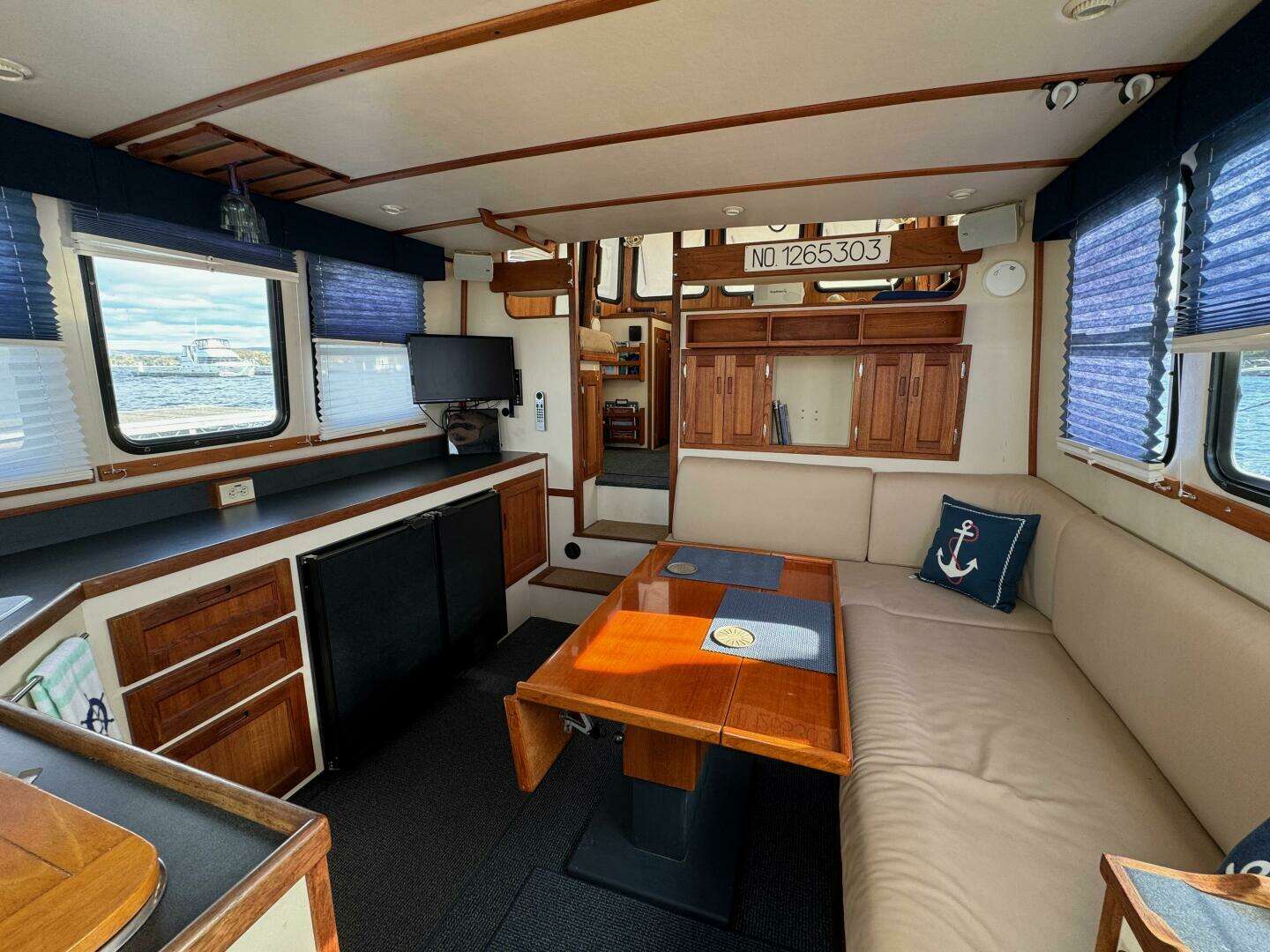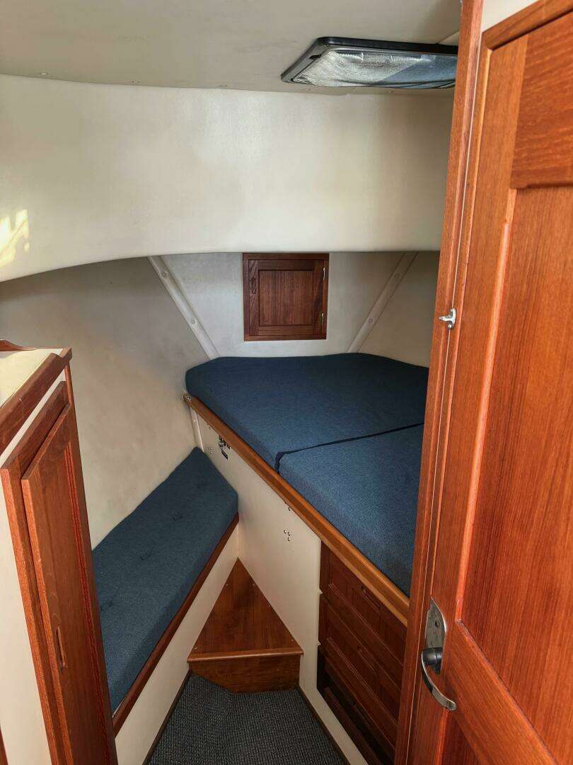 Forward cabin with starboard side double pullman berth to starboard, hanging locker to port, blue upholstery. Main salon with carpeting helm station forward to starboard. Galley aft to port. Salon settee table to starboard also converts to double berth.