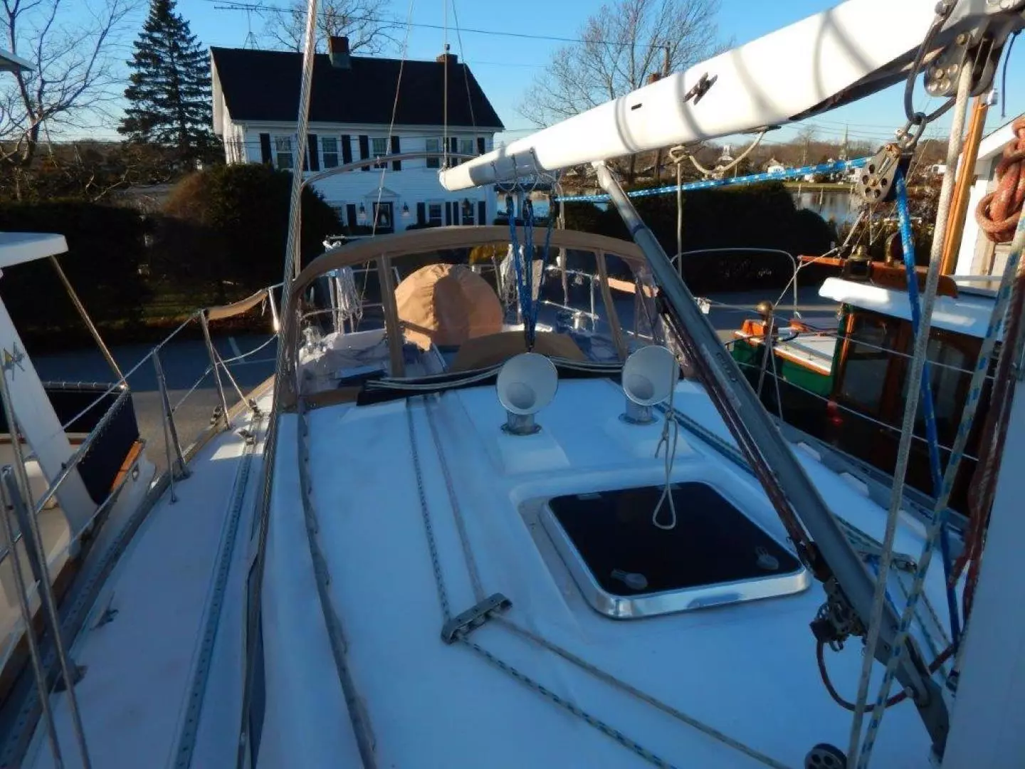 - Rope boom vang led aft to the cockpit