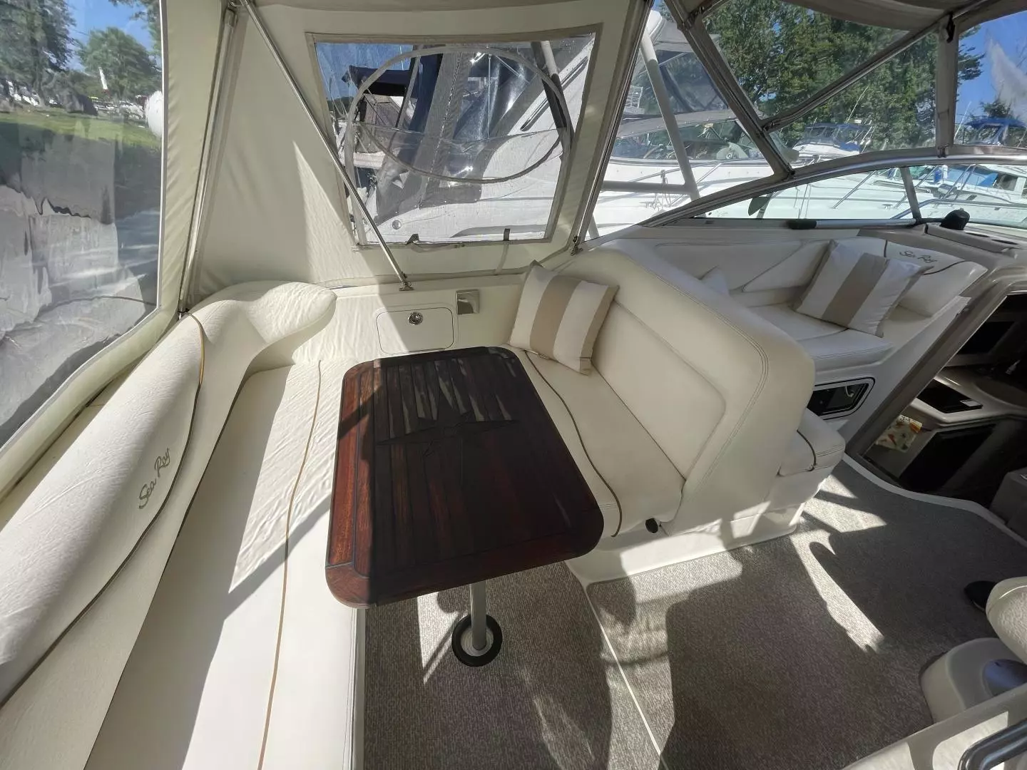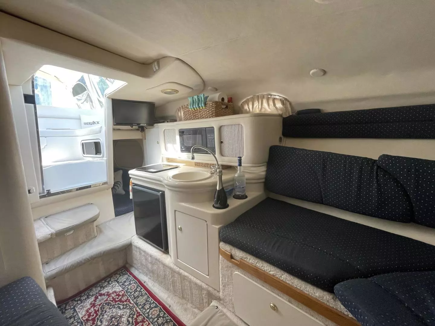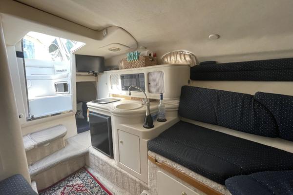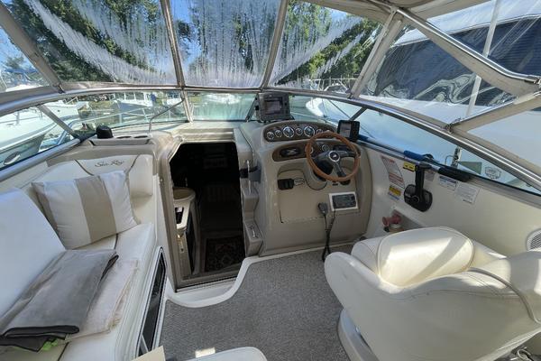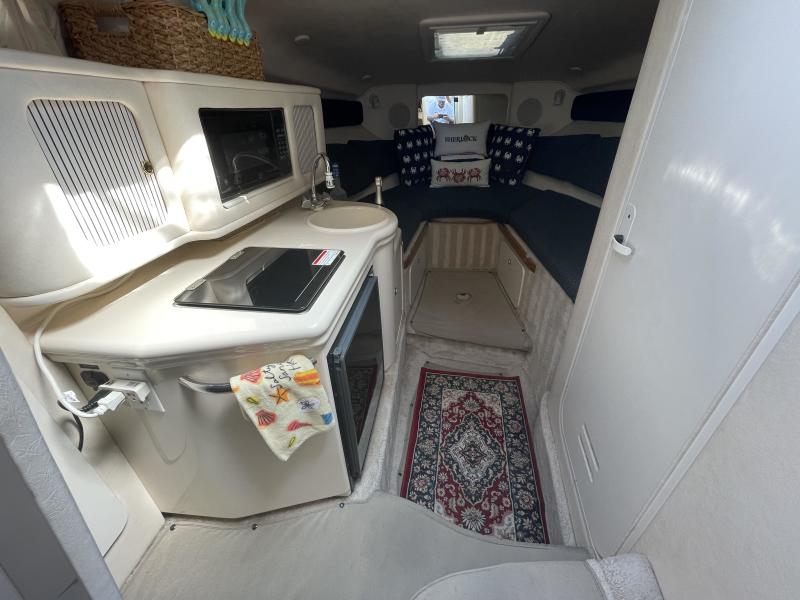 There are times when the agility of a sport boat is desired, but the passenger room of a cruiser is absolutely required. Now the best of both is available in the Sea Ray 260 Sundancer. With its standard 240 horsepower Bravo II stern drive, this boat can power through any challenge family boating demands - and with a comfortable cabin, the fun can continue long after the crowd has headed for the dock. The cockpit offers a large amount of seating space with a portside sunlounger featuring a forward-facing backrest, and an aft-facing seat back for a comfortable group setting. The large aft-facing seat to port can be folded down into a sunpad for extra lounging room. A foldaway aft seat makes it a breeze to seat even more passengers while providing easy access to the engine hatch when in its upright position. The Sea Ray 260 Sundancer has a cockpit entertainment center complete with wet bar and removable cooler with its own dedicated storage space. There's also plenty of room for gear in the cockpit side storage, and in the aft wall fender area. For those who enjoy water sports, the standard add-on swim platform is extra-large with a concealed ladder in the port hatch, and it's bracketed for easy removal. A transom door also makes boarding a lot more convenient. Below, the cabin gets plenty of natural light from the translucent deck hatch with a 20 x 20 sky screen cover to keep things cool during the day. By night, the cabin offers directional lighting, and comfortable eating and sleeping quarters. The cook has a full-service fiberglass galley countertop with a sink, single-burner butane stove, and dual-voltage refrigerator. The dining table is removable and has its own storage compartment, plus there's a convertible dinette with storage below. When the V-berth filler cushions are inserted, there's plenty of room for two to enjoy a good night's sleep. Additional sleeping space can be found in the mid stateroom with its double bunk, window, and privacy curtain. The Sea Ray 260 Sundancer also has a 12V Clarion AM-FM digital cassette stereo with four speakers and a cockpit remote control. Of course, everyone appreciates the convenience of the fully enclosed fiberglass head with sink, shower, vanity,and pump-out head. As an added safety measure, Sea Ray includes a standard carbon monoxide monitor. When traveling with guests, the last thing the captain wants to do is spend a lot of time on maintenance. That's why the 260 Sundancer keeps things simple with a self-bailing fiberglass cockpit liner, color-coded wiring with chafe protection, dockside power, and a pressure water system - all standard. It's also built to last with high-performance vinylester resin and Arctic white gelcoat on the hull, stainless steel fittings, and marine-grade vinyl and carpeting. There's also a choice of three stylish color schemes - blue, green or black and tan. The 260 Sundancer has a list of standard equipment including power tilt and trim, power steering, hydraulic trim tabs, and more as well as an option list which includes central heat and air.