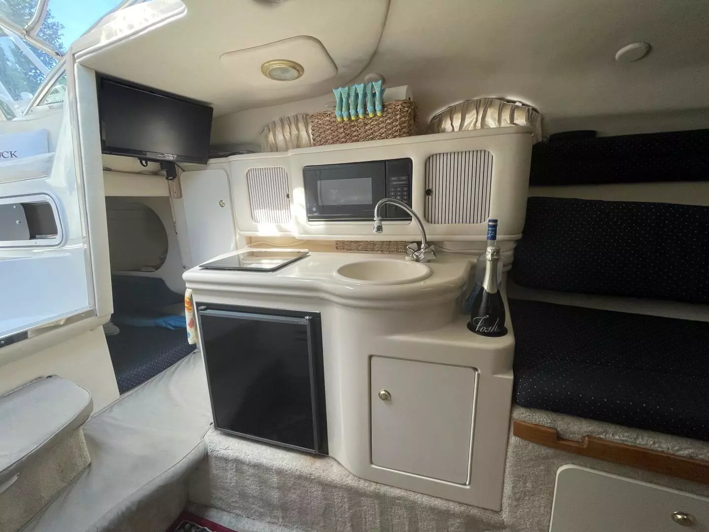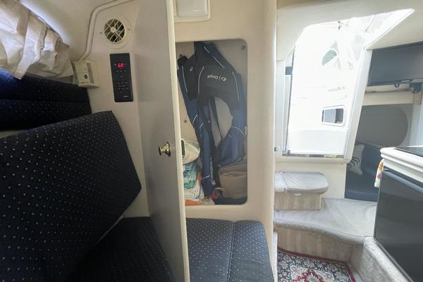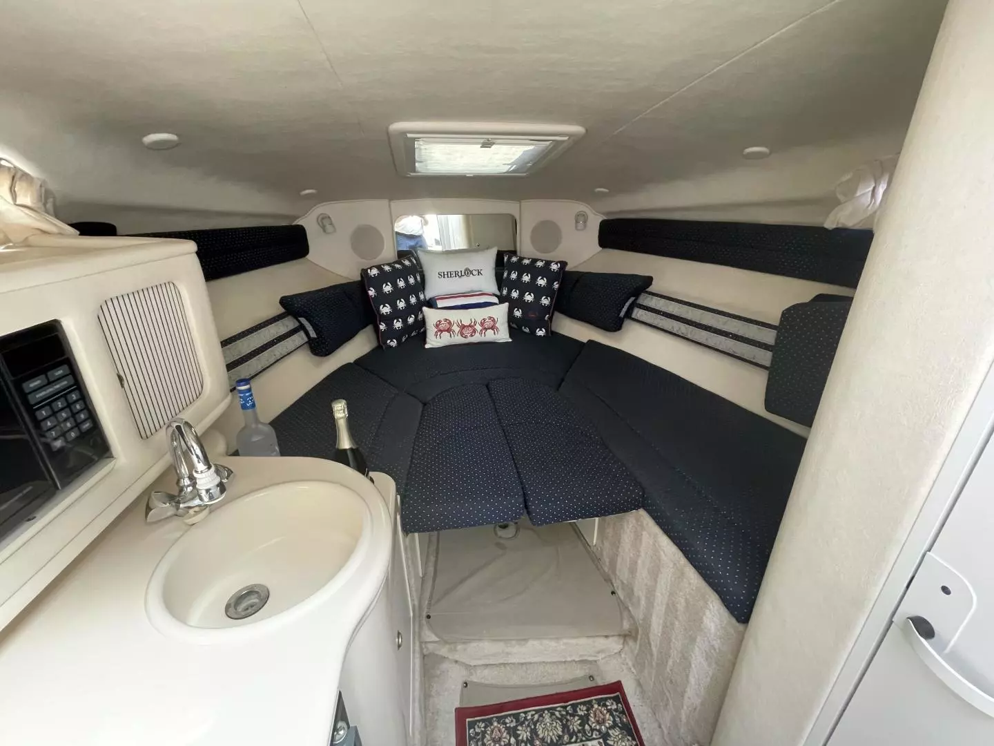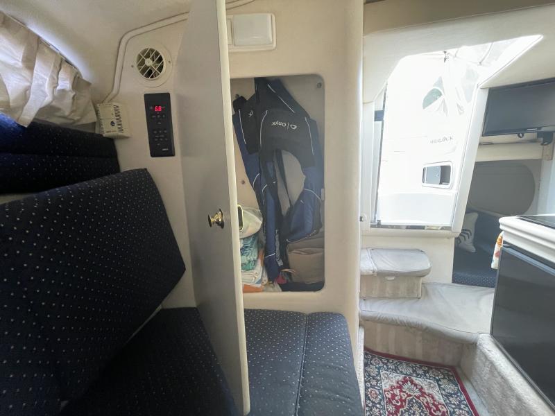 There are times when the agility of a sport boat is desired, but the passenger room of a cruiser is absolutely required. Now the best of both is available in the Sea Ray 260 Sundancer. With its standard 240 horsepower Bravo II stern drive, this boat can power through any challenge family boating demands - and with a comfortable cabin, the fun can continue long after the crowd has headed for the dock. The cockpit offers a large amount of seating space with a portside sunlounger featuring a forward-facing backrest, and an aft-facing seat back for a comfortable group setting. The large aft-facing seat to port can be folded down into a sunpad for extra lounging room. A foldaway aft seat makes it a breeze to seat even more passengers while providing easy access to the engine hatch when in its upright position. The Sea Ray 260 Sundancer has a cockpit entertainment center complete with wet bar and removable cooler with its own dedicated storage space. There's also plenty of room for gear in the cockpit side storage, and in the aft wall fender area. For those who enjoy water sports, the standard add-on swim platform is extra-large with a concealed ladder in the port hatch, and it's bracketed for easy removal. A transom door also makes boarding a lot more convenient. Below, the cabin gets plenty of natural light from the translucent deck hatch with a 20 x 20 sky screen cover to keep things cool during the day. By night, the cabin offers directional lighting, and comfortable eating and sleeping quarters. The cook has a full-service fiberglass galley countertop with a sink, single-burner butane stove, and dual-voltage refrigerator. The dining table is removable and has its own storage compartment, plus there's a convertible dinette with storage below. When the V-berth filler cushions are inserted, there's plenty of room for two to enjoy a good night's sleep. Additional sleeping space can be found in the mid stateroom with its double bunk, window, and privacy curtain. The Sea Ray 260 Sundancer also has a 12V Clarion AM-FM digital cassette stereo with four speakers and a cockpit remote control. Of course, everyone appreciates the convenience of the fully enclosed fiberglass head with sink, shower, vanity,and pump-out head. As an added safety measure, Sea Ray includes a standard carbon monoxide monitor. When traveling with guests, the last thing the captain wants to do is spend a lot of time on maintenance. That's why the 260 Sundancer keeps things simple with a self-bailing fiberglass cockpit liner, color-coded wiring with chafe protection, dockside power, and a pressure water system - all standard. It's also built to last with high-performance vinylester resin and Arctic white gelcoat on the hull, stainless steel fittings, and marine-grade vinyl and carpeting. There's also a choice of three stylish color schemes - blue, green or black and tan. The 260 Sundancer has a list of standard equipment including power tilt and trim, power steering, hydraulic trim tabs, and more as well as an option list which includes central heat and air.