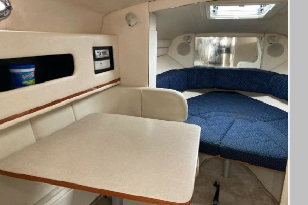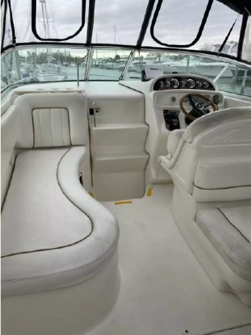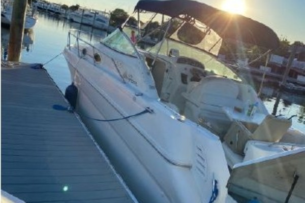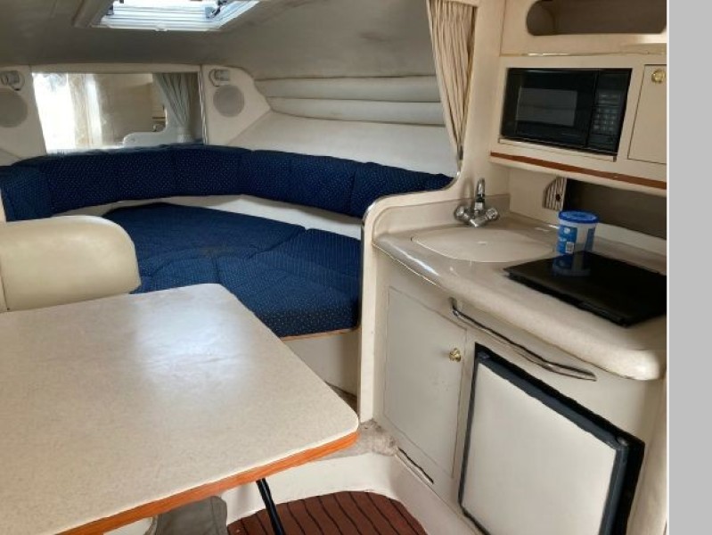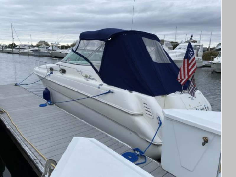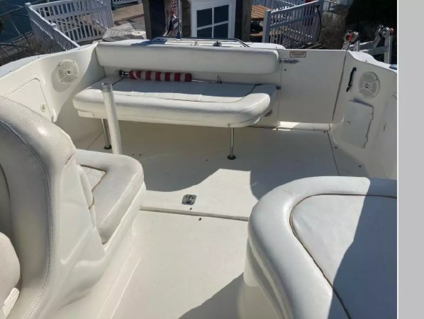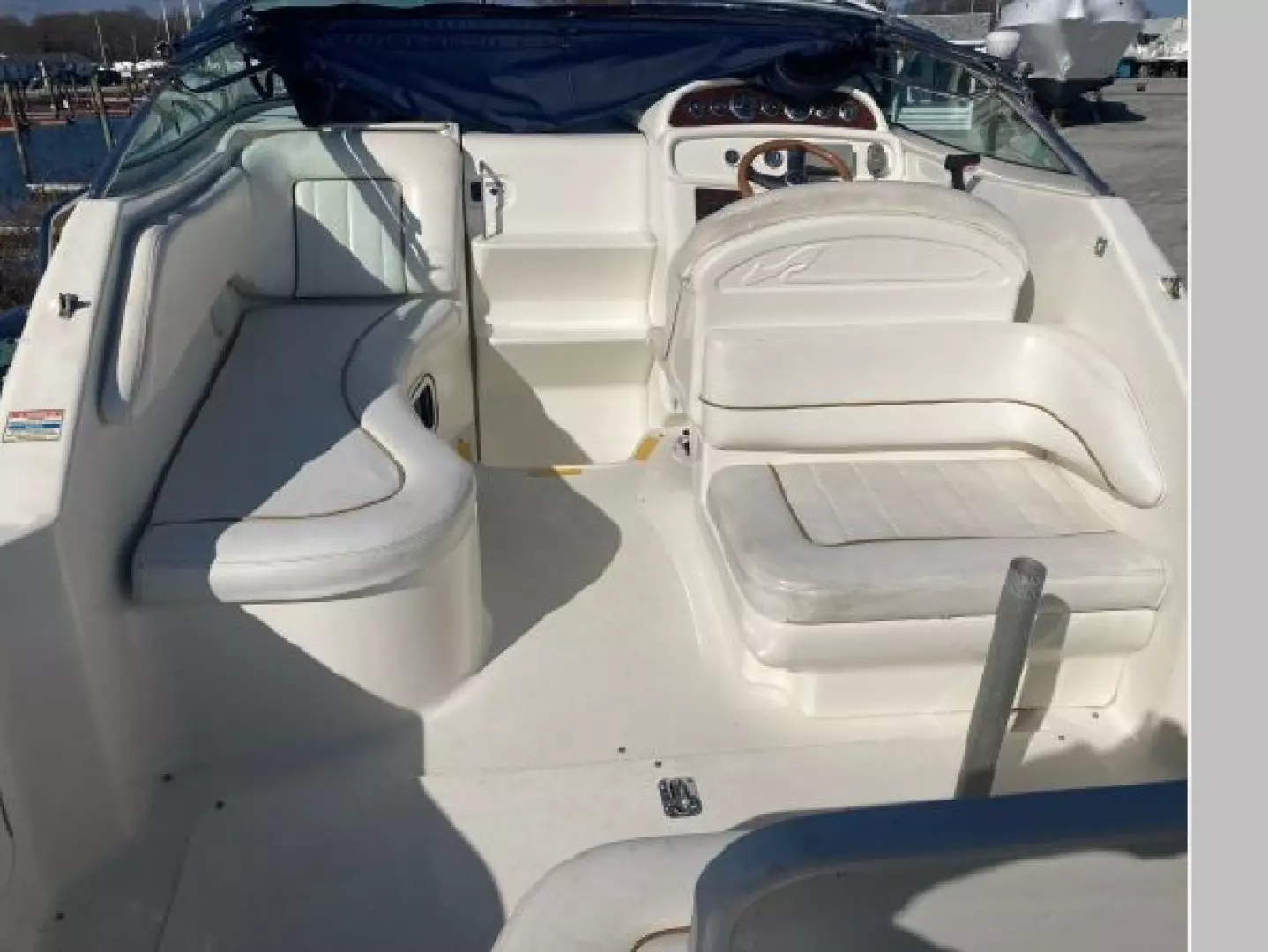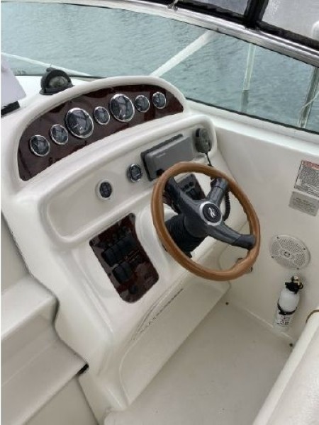 Over the years Sea Ray has had many versions of the 270 Sundancer however the 1998-2001 models had a wider (non trailerable) 9' 2" beam. The added width makes for a roomier boat so the interior is quite spacious for a 27 footer with accommodations for up to six. There's a V-berth forward, a double-berth in the mid cabin, a convertible dinette, compact galley and an enclosed head. There's lots of outside seating and a handy walk-thru windshield. Powered with a 310hp Mercruiser 7.4 liter engine (475 hrs) with a Bravo III stern drive.
