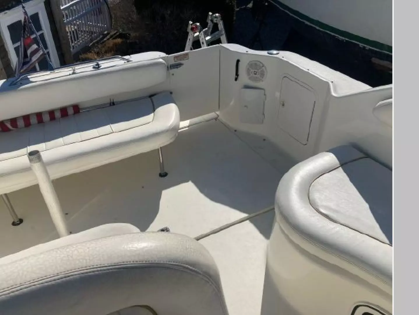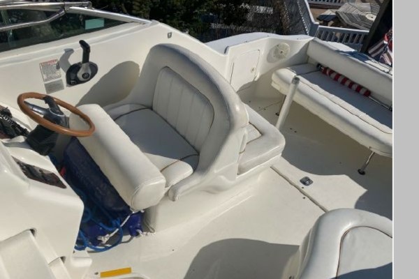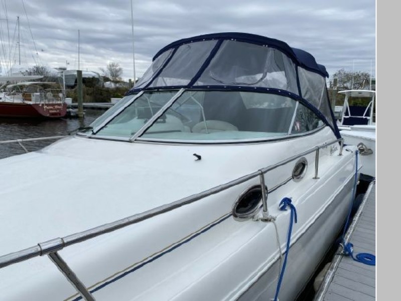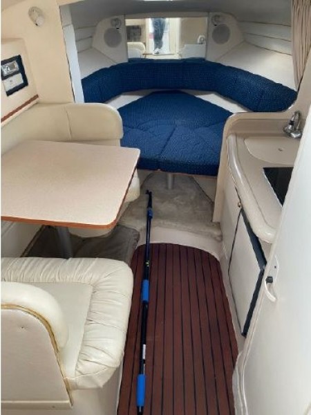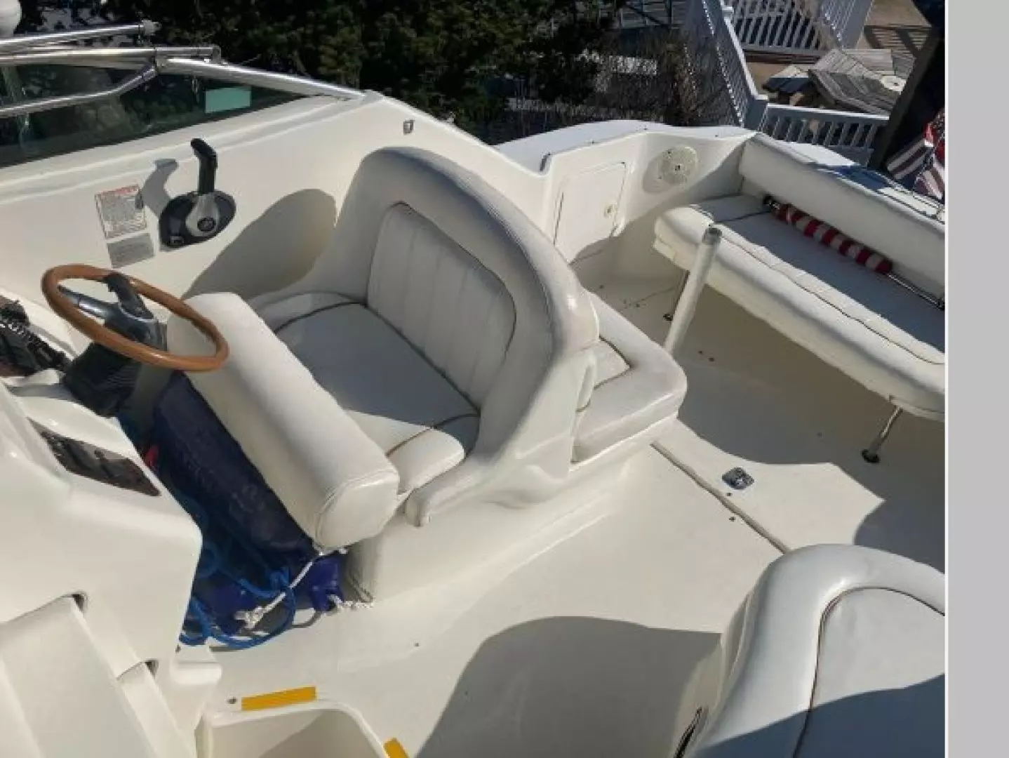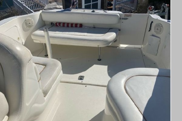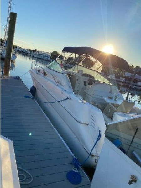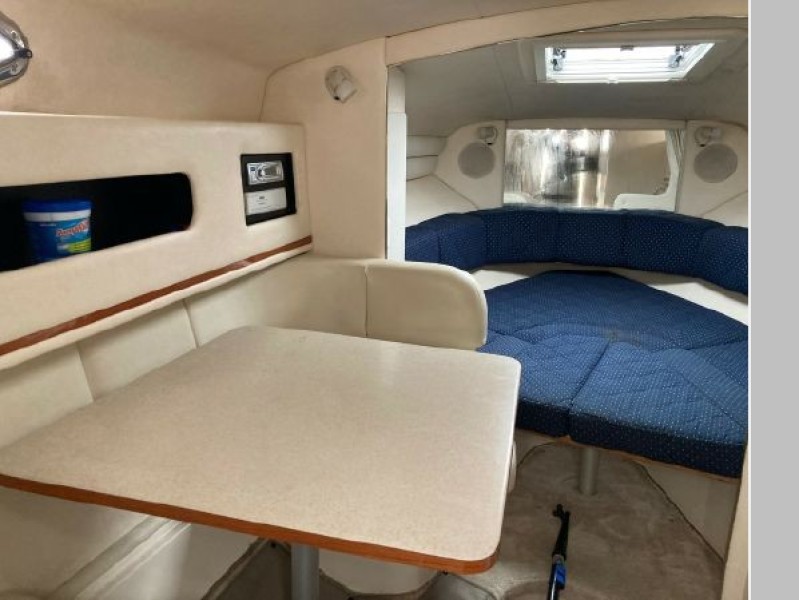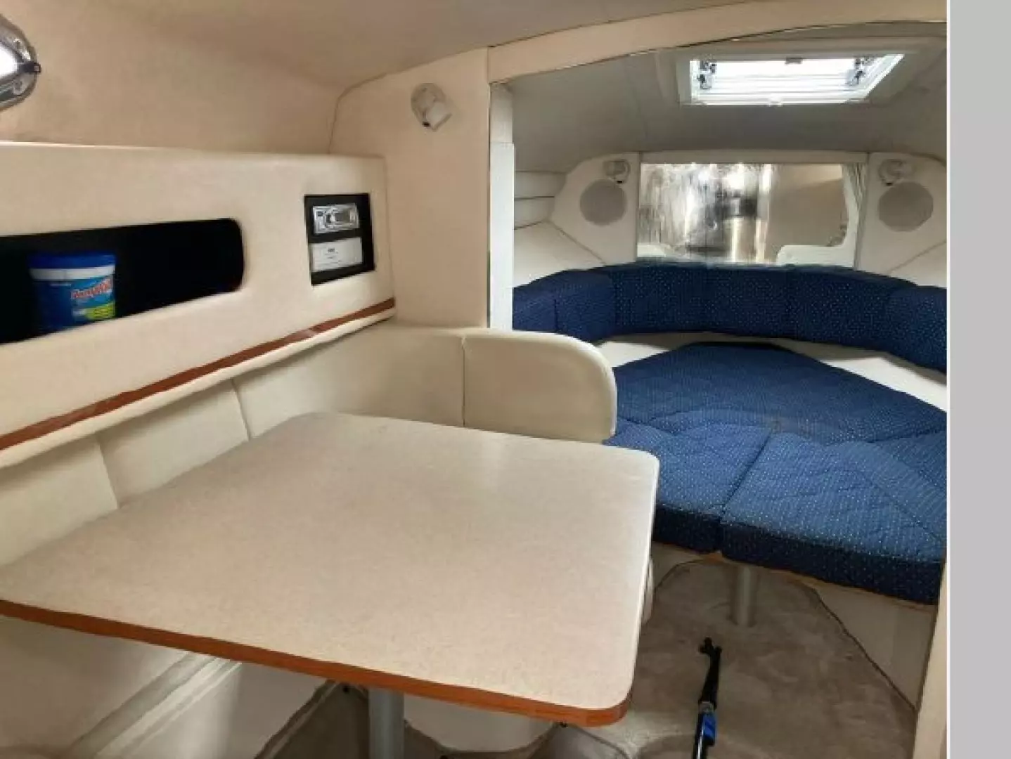 Over the years Sea Ray has had many versions of the 270 Sundancer however the 1998-2001 models had a wider (non trailerable) 9' 2" beam. The added width makes for a roomier boat so the interior is quite spacious for a 27 footer with accommodations for up to six. There's a V-berth forward, a double-berth in the mid cabin, a convertible dinette, compact galley and an enclosed head. There's lots of outside seating and a handy walk-thru windshield. Powered with a 310hp Mercruiser 7.4 liter engine (475 hrs) with a Bravo III stern drive.
