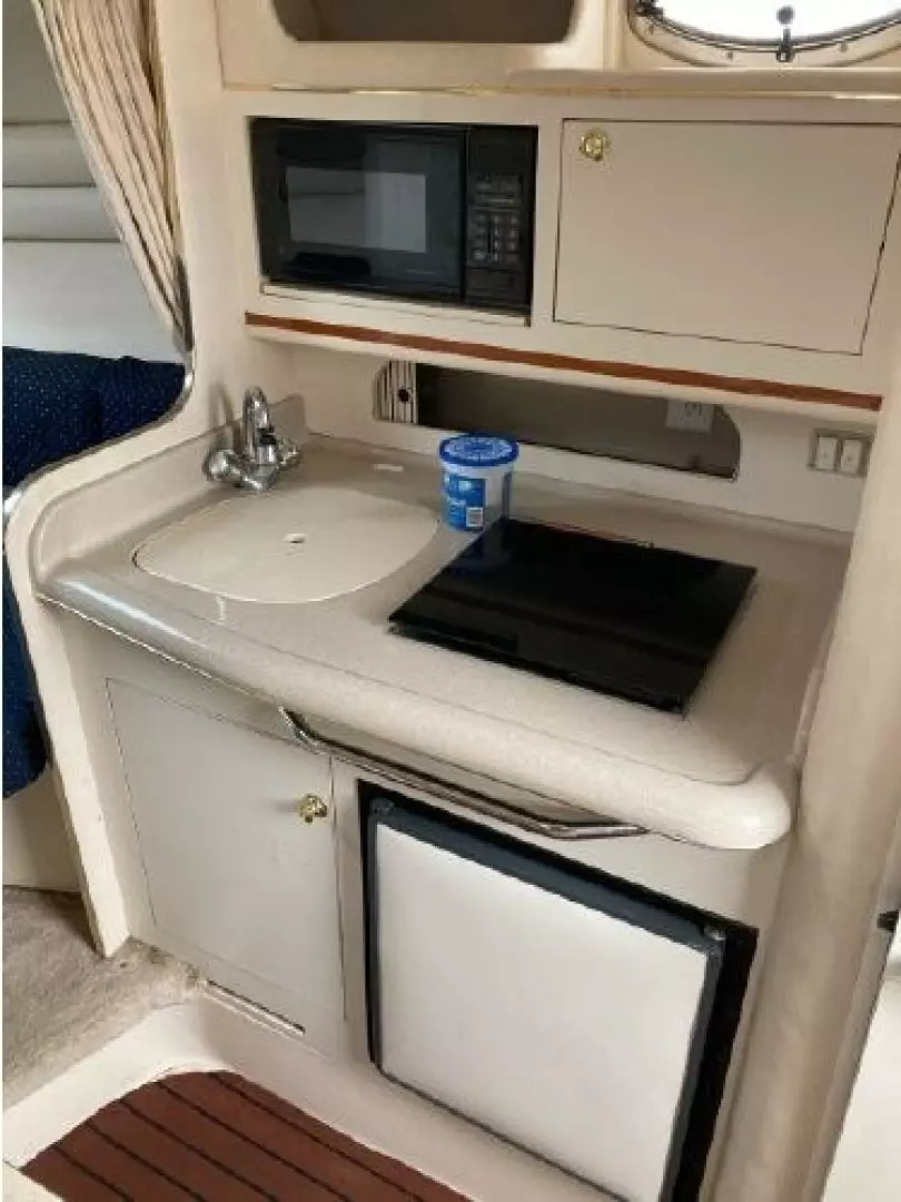 - Galley w/ Kenyon 1 burner LPG stove, microwave, refrigerator and molded sink