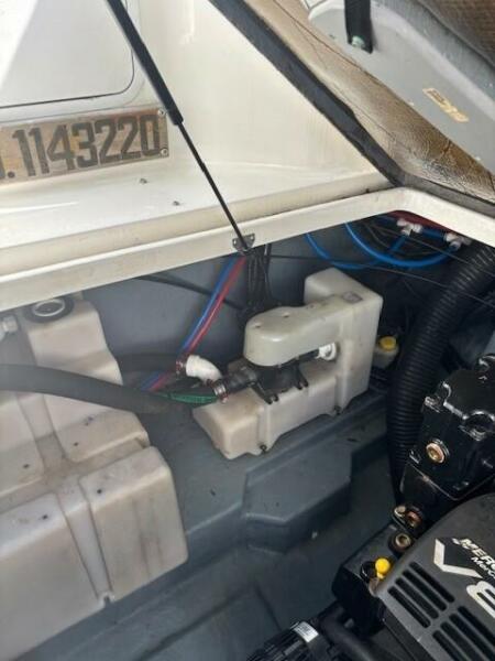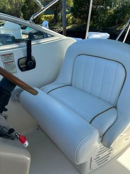 Forward you have a full width V-berth with filler cushion, hanging locker and ventilation hatch. Aft to starboard is the galley area followed by the enclosed head with shower. Aft to port is the convertible dinette area followed by the aft cabin. Up a couple of steps to the helm deck with the helm to starboard and a lounge settee seat to port. Aft of the helm seat you have a rear facing seat with a removeable cooler underneath. Aft against the transom you have a forward facing bench seat which automatically folds away when the engine hatch is lifted. Out the transom door to the extended swim platform.