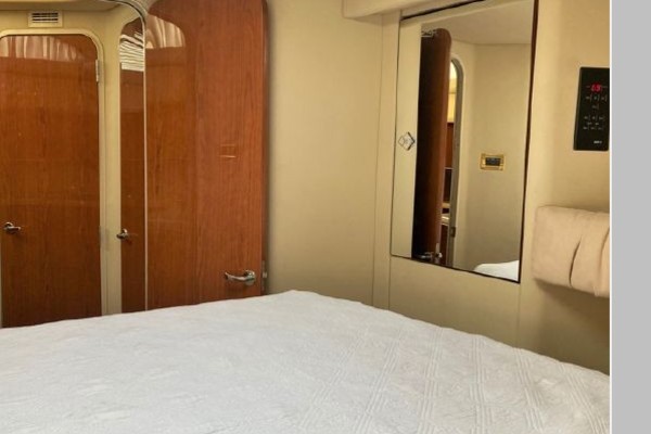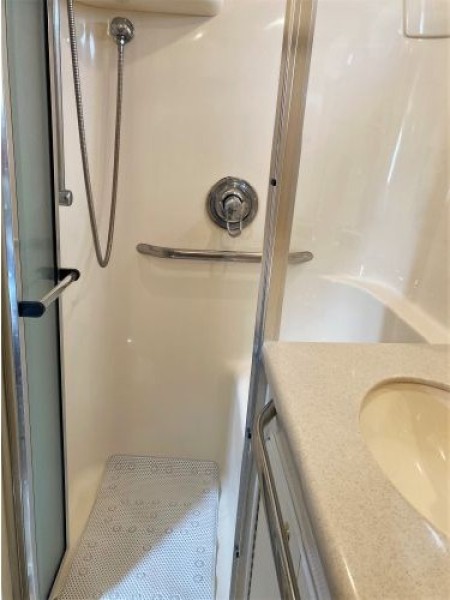 - Going aft, down three steps is the master stateroom with storage lockers, ensuite head with VacuFlush toilet, vanity and stall shower.