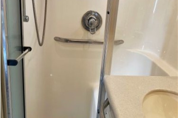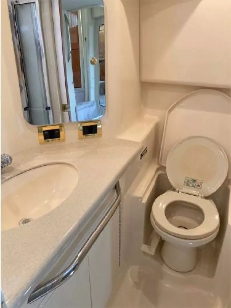 - Port side guest head has a VacuFlush toilet, vanity and shower