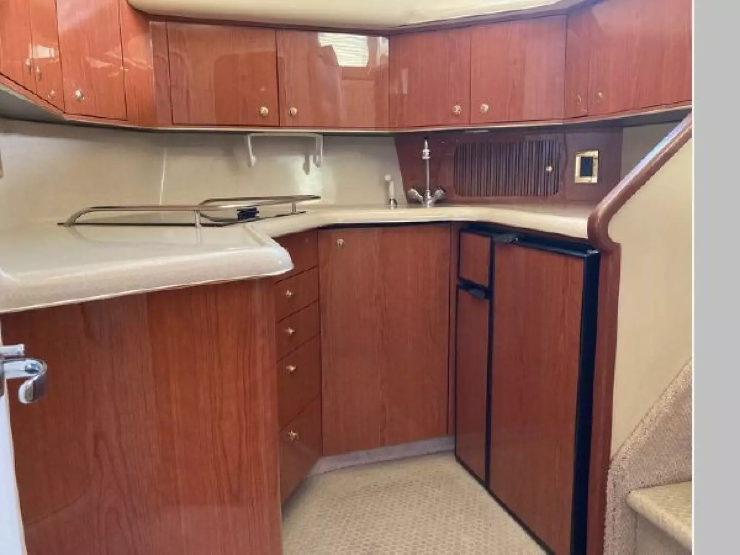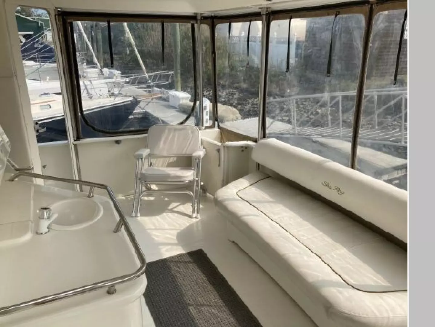 - Marine carpeting throughout with vinyl floor at galley