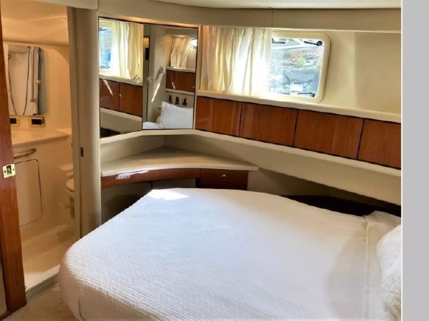 - Forward guest stateroom with centerline island double berth and storage compartments
