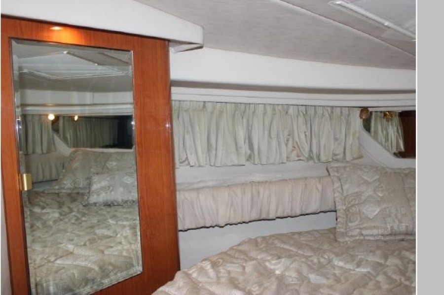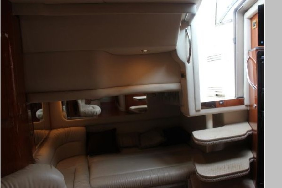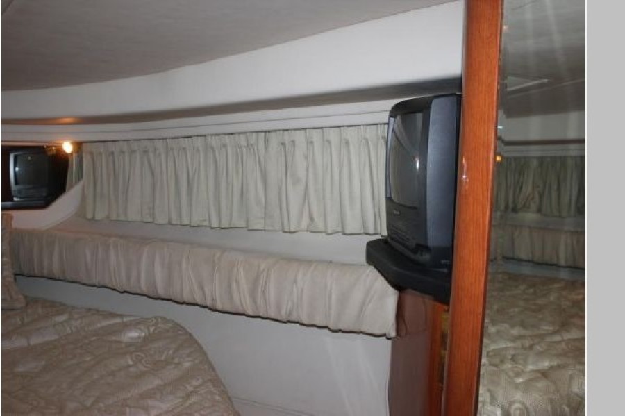 For the definition of performance and styling, the Sea Ray 380 Sundancer is the vessel that quickly comes to mind. Her sleek styling and 13’ beam coupled with all of the Sea Ray options will take you through heavy seas with complete certainty and maximum comfort. Her cockpit is designed for maximum entertainment space with a captain's helm seat and a double-wide companion seat side-by-side, a huge U-shaped aft seating area, a wet bar with sink and refrigerator, stern H&C shower and a CD stereo system with in-dash remote. The well equipped galley is set up for easy living with a large refrigerator/freezer, two-burner electric stovetop, microwave, coffee maker, sink with cutting board and loads of storage. The forward stateroom features a full-size pedestal bed with an innerspring mattress, port and starboard vanities and hanging lockers with mirrored doors and is equipped with a pocket door for added privacy. The large aft berth with privacy curtain converts to a nice sized lounge for those active times and the sofa also converts to a double bed for extra guests. She has a remote spotlight, trim tabs, windlass, stern storage boot, stern shower and shore power. Electronics include Clarion stereo with in-dash remote, flatscreen TV in the salon, Raymarine HybridTouch radar/plotter/GPS, Raymarine Tridata, Uniden VHF and Raymarine Autopilot. She is equipped with T-350 HP Caterpillar 3126’s with 1365 hours and a 7.5kW genset. Come take a look, you will not be disappointed!