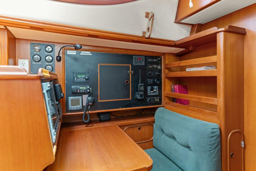 Descending the companionway, the raised main salon offers two large settees, a dining table, and a navigation station to starboard. To port, the passageway galley leads aft to the spacious owner's stateroom, which features a center-line queen berth and an en-suite head with a separate shower stall. Moving forward, a port passageway provides a custom desk with a removable stool, which can also be utilized in the main salon for extra seating. The forward V-berth cabin has adjacent access to the day head/wet head. Callahan can comfortably sleep six people across its two cabins and the convertible settee in the main salon and provides plentiful storage throughout.