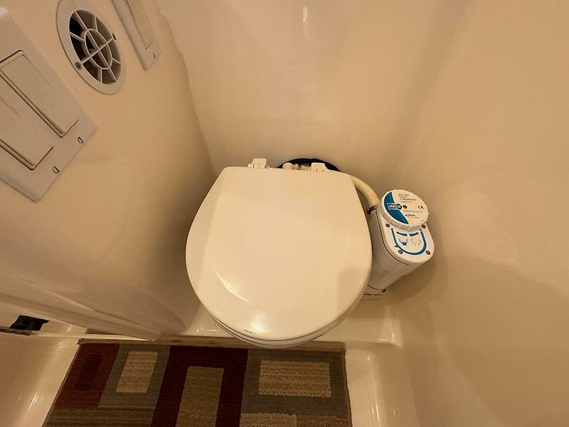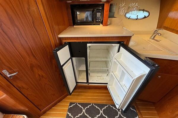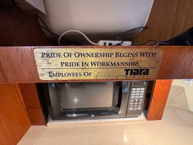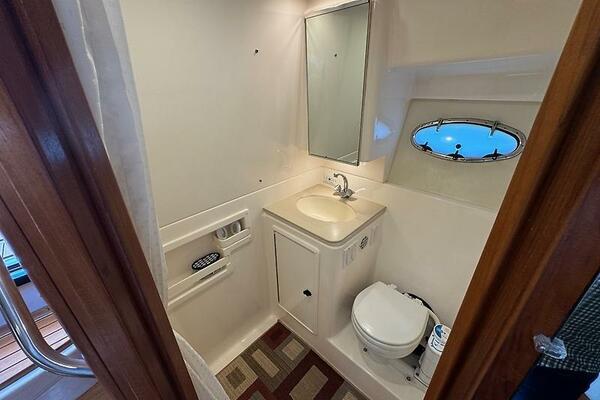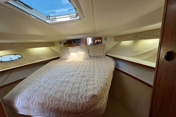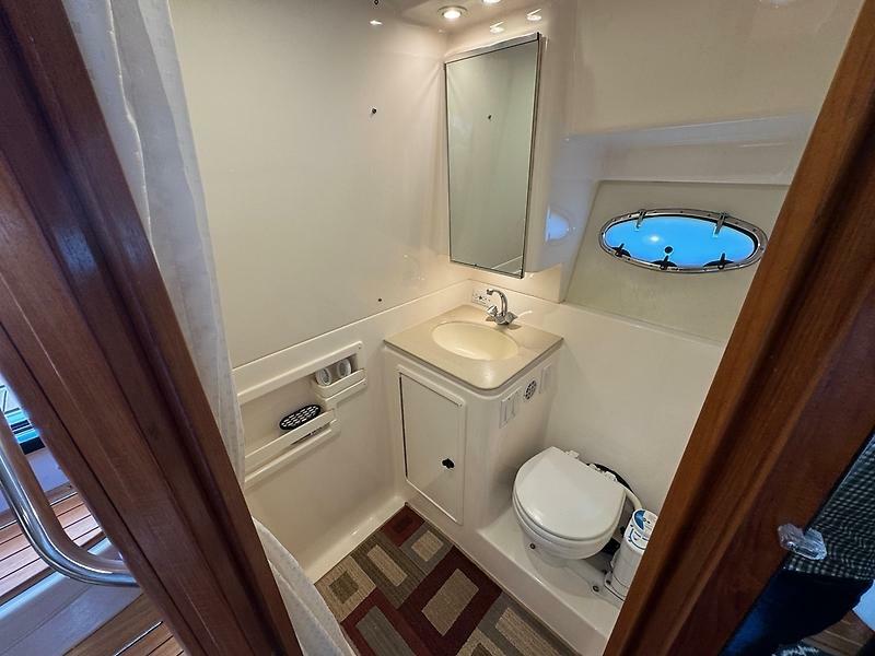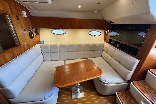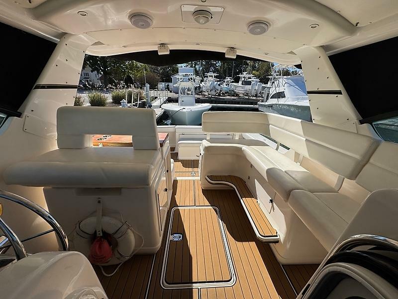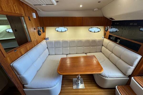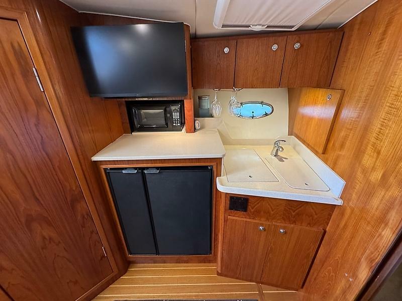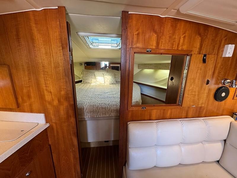 Below deck, the Tiara 3500 offers a bright, inviting interior. A large convertible dinette sits to starboard, opposite a fully equipped galley to port. The forward stateroom features a solid privacy door, hanging lockers, and dedicated storage. The enclosed head includes a shower, vanity, and Jabsco electric toilet.