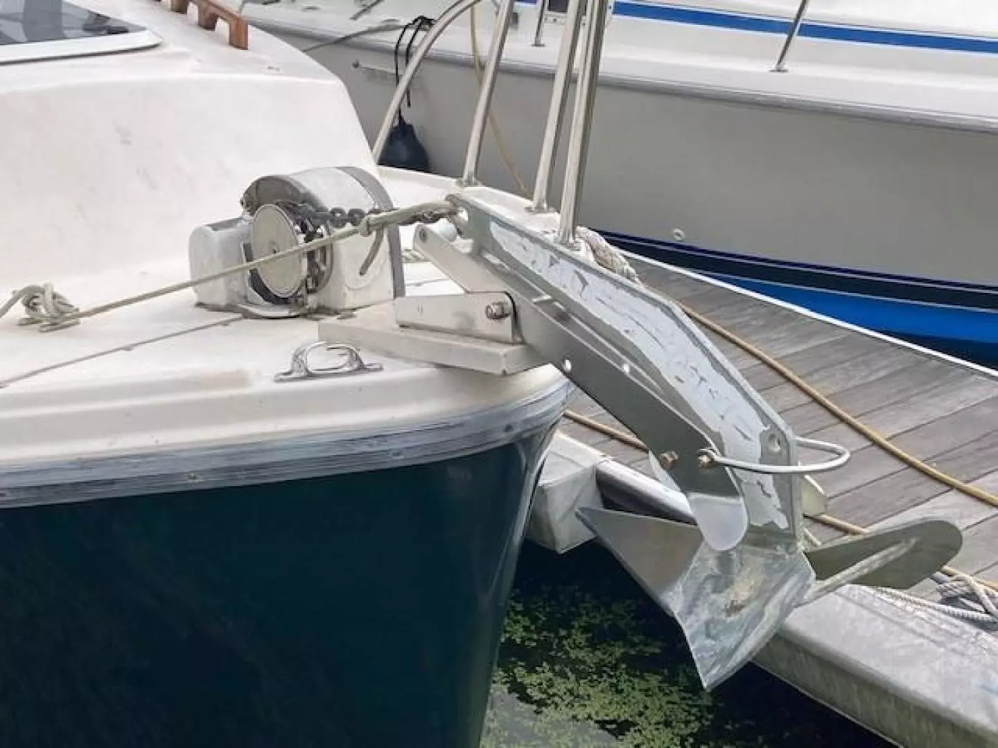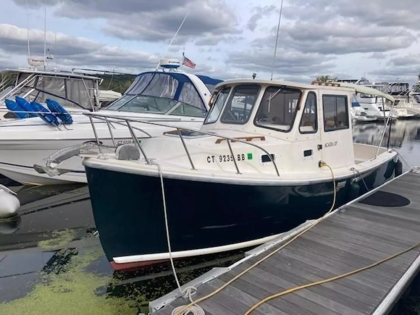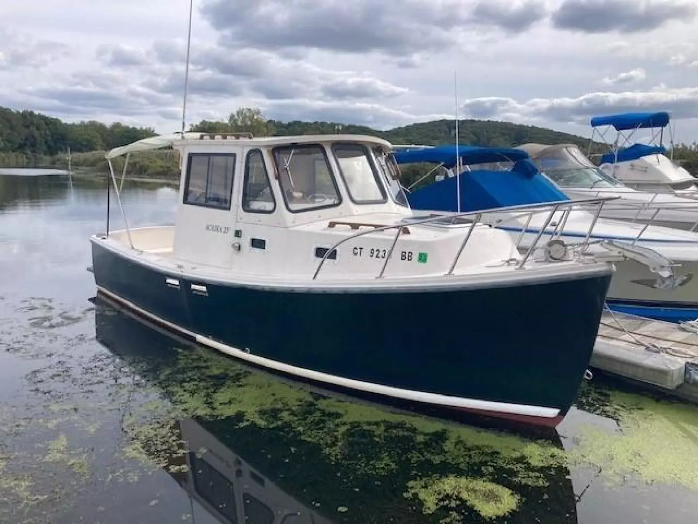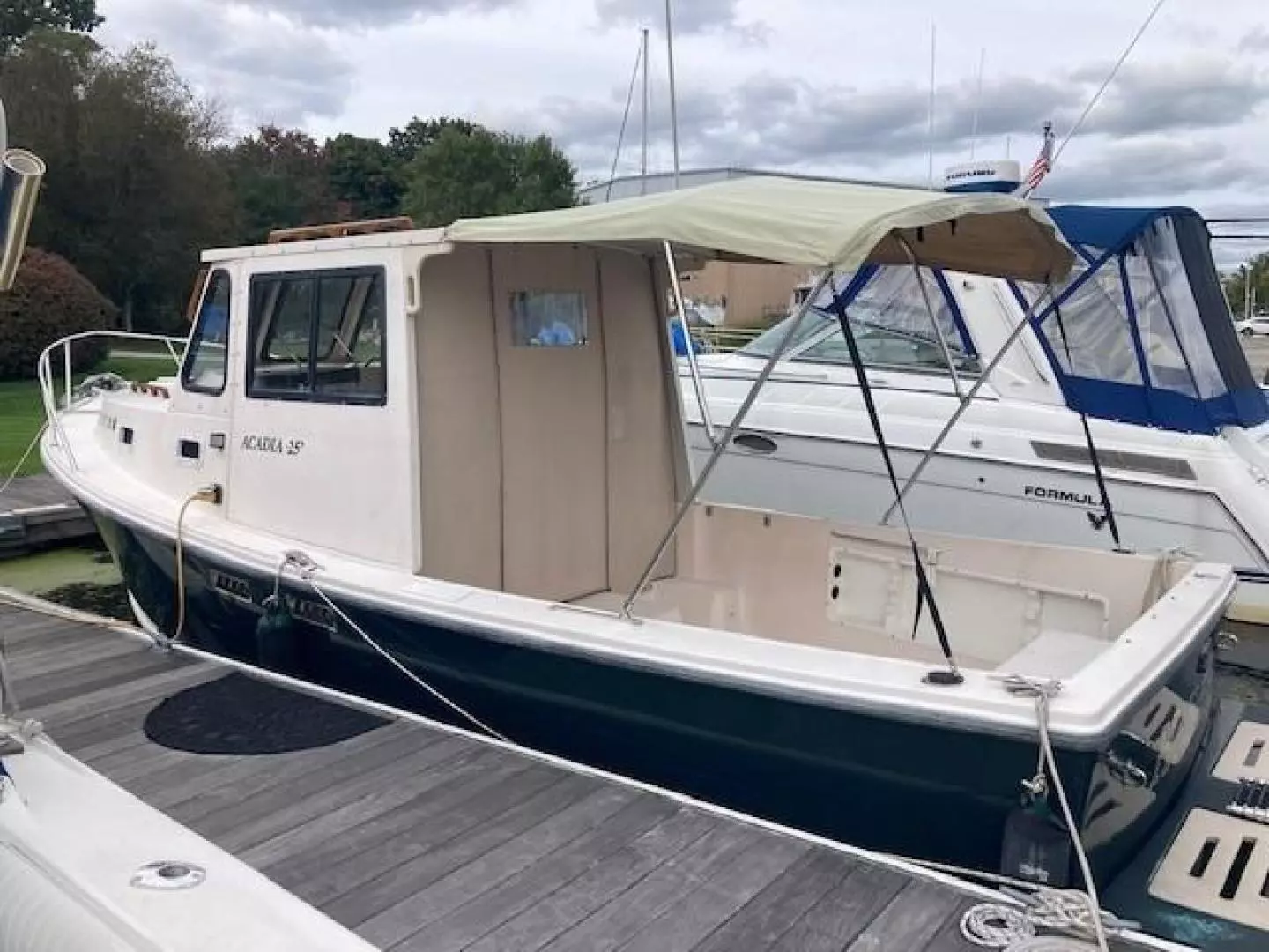 The Atlas Acadia 25 is perfect for boaters desiring a classic, Downeast style boat in a compact, trailerable size. Holiday is a pilothouse style boat with a pretty dark green, solid fiberglass hull with full keel and a skeg to protect the propeller. Anchor windlass, GPS, depthfinder, VHF radio, roomy cockpit and a full-size swim platform. Inside, the cozy cabin can sleep two with standing headroom, pressure hot & cold water, a compact galley and an enclosed stand-up head compartment with sink, marine toilet and shower, 110V dockside power with battery charger. Powered by a 170hp Yanmar 4LHDTE diesel engine with 860 hours. NO TRAILER.