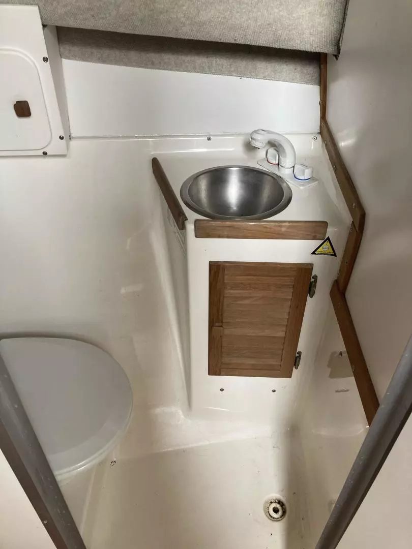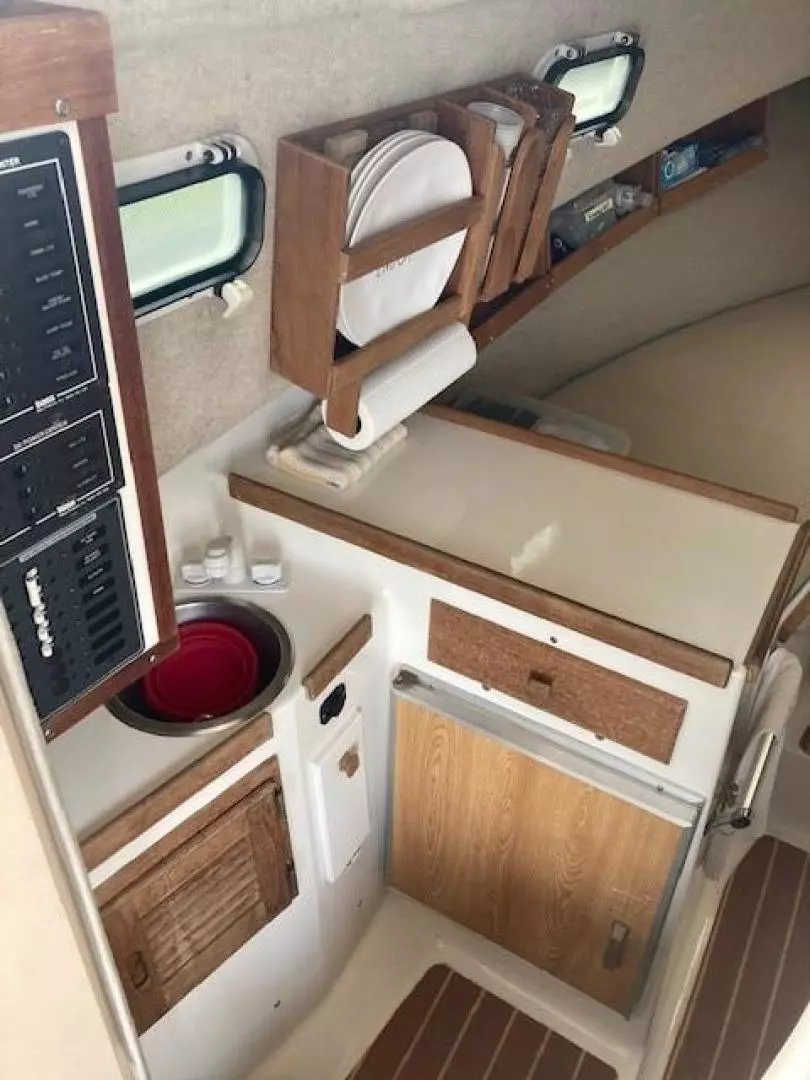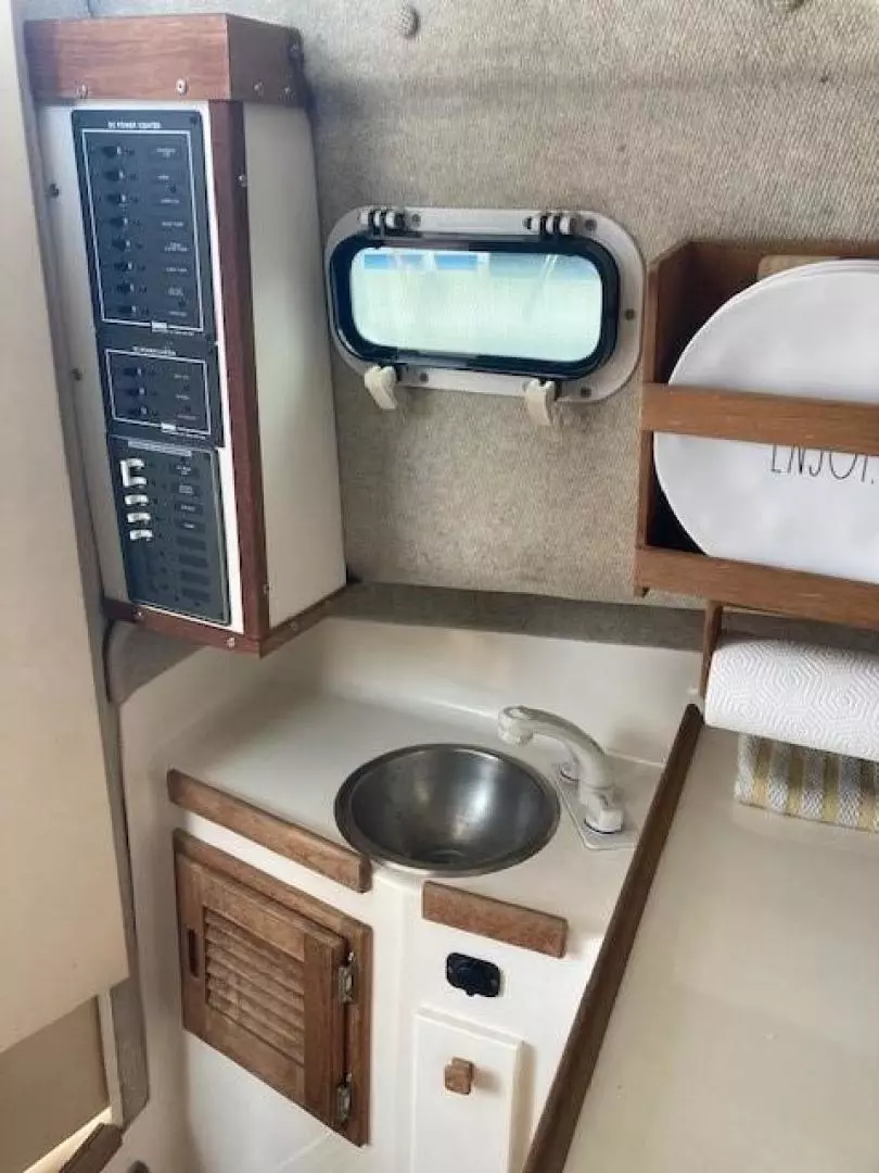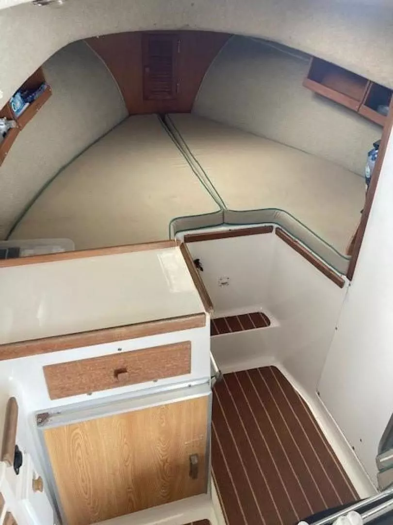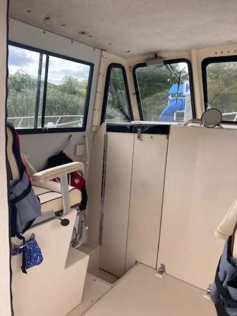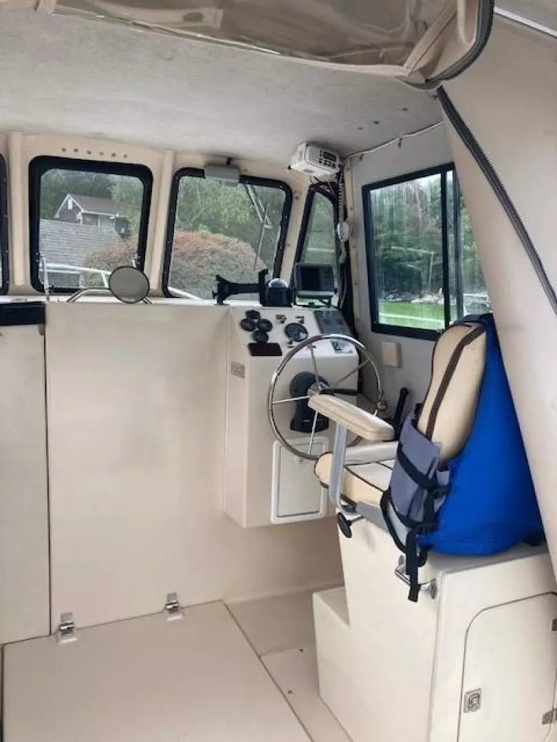 The Atlas Acadia 25 is perfect for boaters desiring a classic, Downeast style boat in a compact, trailerable size. Holiday is a pilothouse style boat with a pretty dark green, solid fiberglass hull with full keel and a skeg to protect the propeller. Anchor windlass, GPS, depthfinder, VHF radio, roomy cockpit and a full-size swim platform. Inside, the cozy cabin can sleep two with standing headroom, pressure hot & cold water, a compact galley and an enclosed stand-up head compartment with sink, marine toilet and shower, 110V dockside power with battery charger. Powered by a 170hp Yanmar 4LHDTE diesel engine with 860 hours. NO TRAILER.