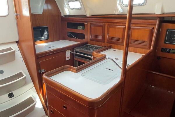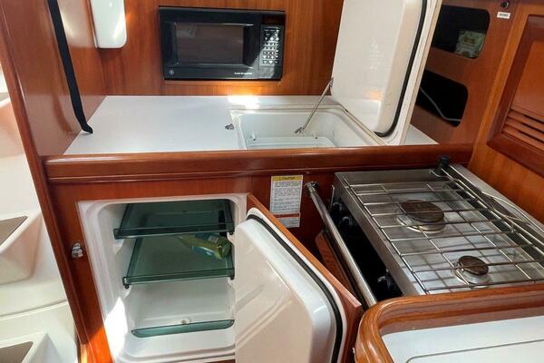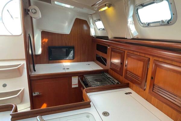 The C-shaped galley is located on the port side, forward of the companionway. It offers ample counter space, a stainless-steel double sink, a two-burner propane stove, a dedicated microwave shelf, and plenty of refrigerated storage (front-loading fridge and icebox). Louvered door lockers and a cutting board cover for the sink complete the setup. Ventilation is provided via a hatch and a porthole above the stove.