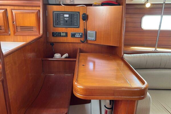 The forward-facing navigation station is next to the galley. It has a seat below, a chart table, an electric panel, and space for instruments.