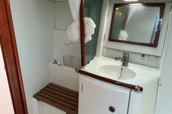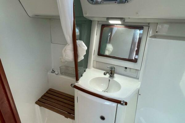 The head is surprisingly spacious, offering full standing headroom and a separate shower stall with a teak seat and electric sump pump. It contains a toilet, a washbasin with a mixer tap, and a mirror. Ventilation is supplied through an opening port.