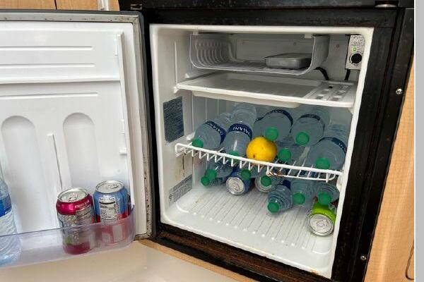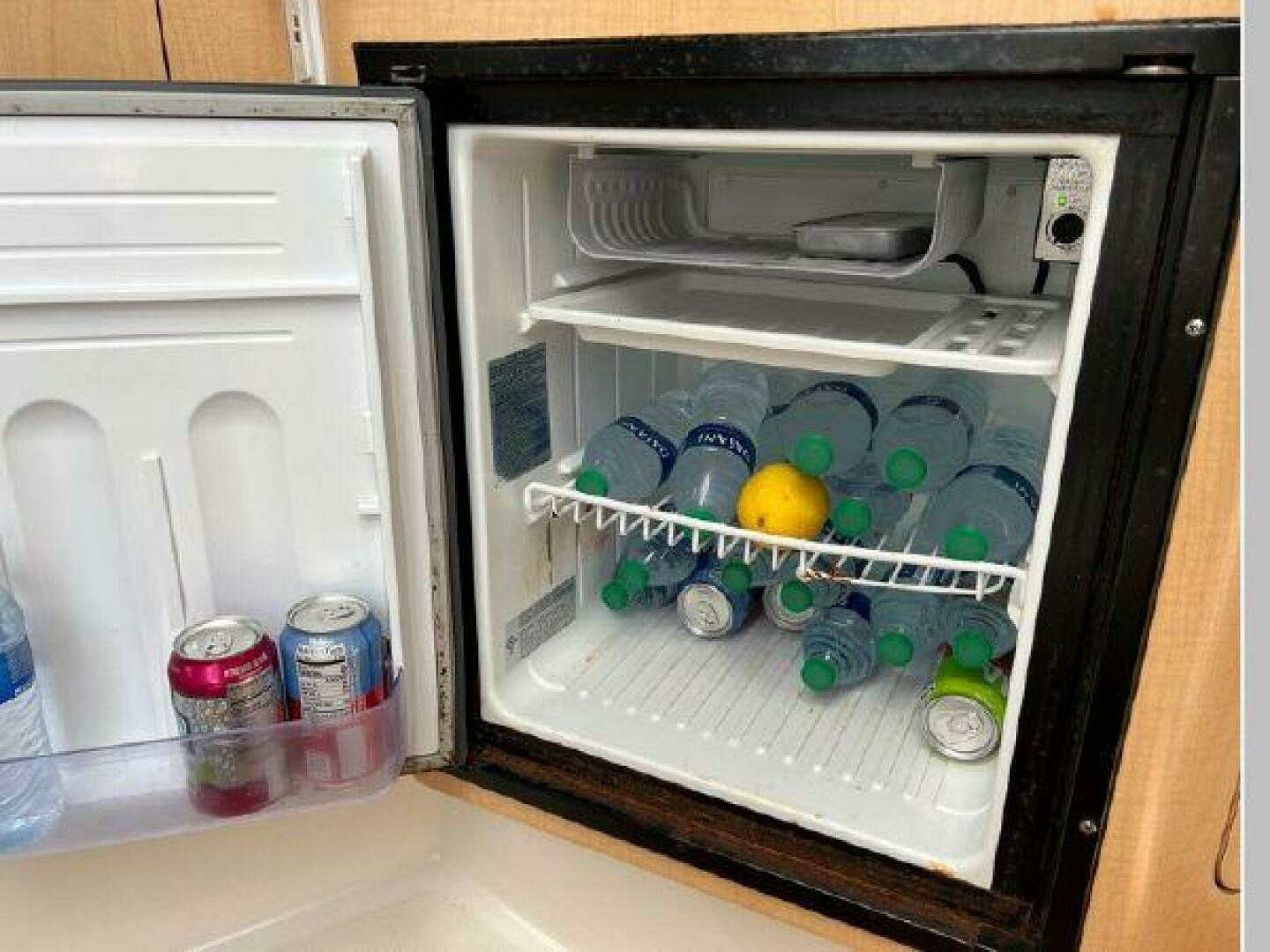 Interior amenities include a full galley with sink, microwave, single burner cooktop, spacious head, and two sleeping areas, and convertible salon that becomes forward birth.