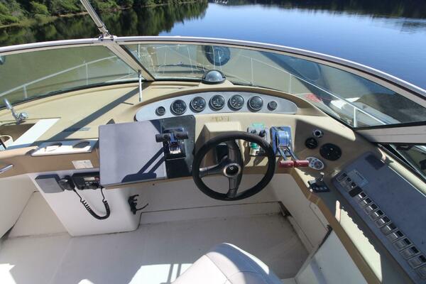 The Carver 350 Mariner is very sleek and modern in her design. Easy access to the bridge via sidesteps port or starboard, bring you to the entertainment center of this vessel. Plenty of seating plus convenience with a wet-bar and ice maker makes for easy socializing.