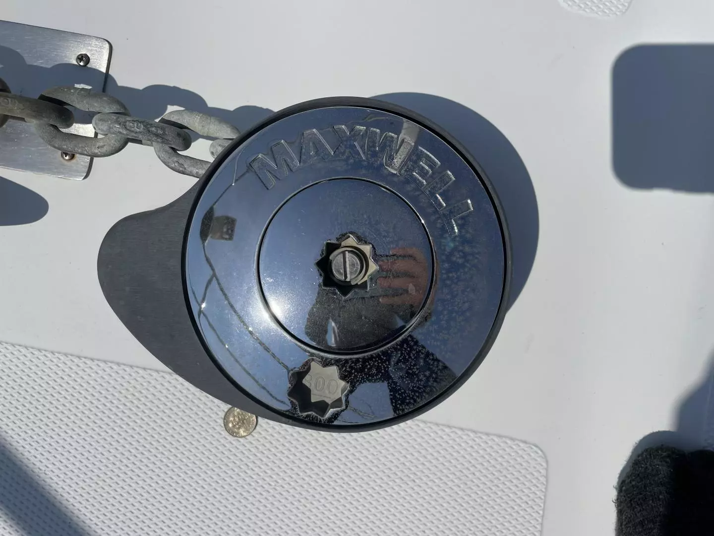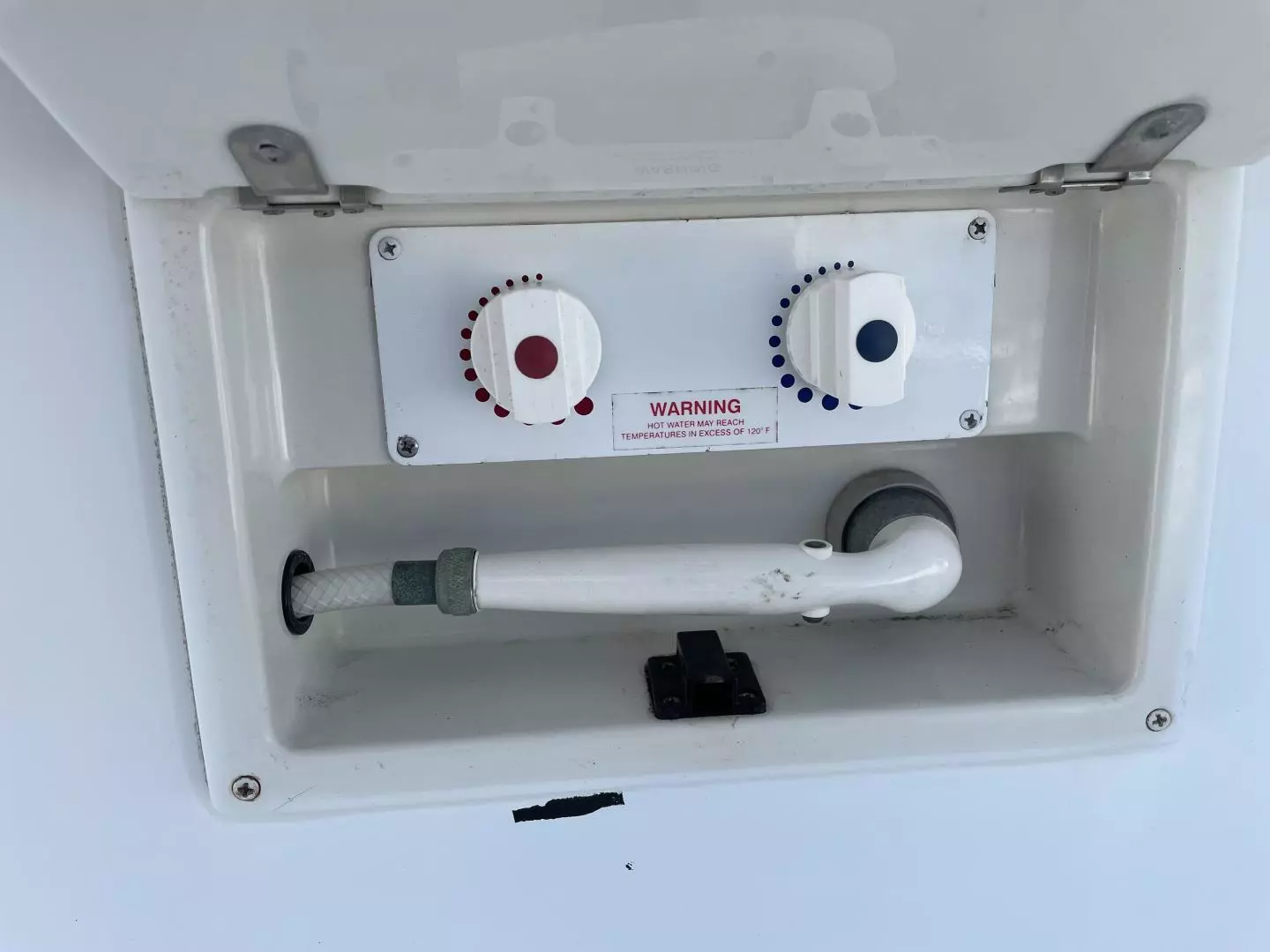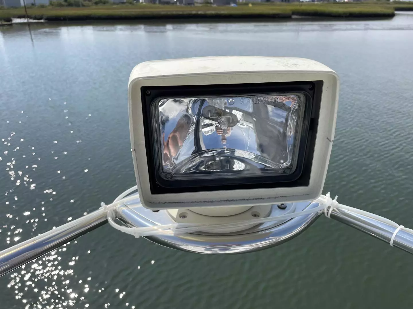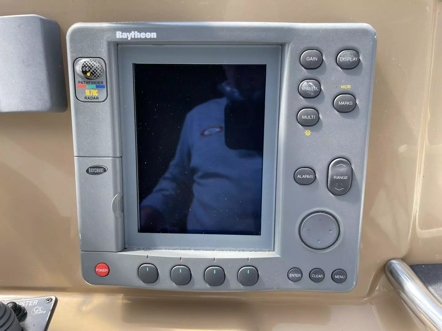 AFT DECK - 73 ft2 (approx.), integral to deck, self-draining. Cleats (2) - 10" stainless steel, through-bolted through aluminum backing plate, inboard-mounted with stainless steel hawse pipes. Command bridge stairway - integral to deck with stainless steel handrail. Electronics arch - custom aluminum with acrylic polyurethane surface coating and UV protection. Electronics arch access plates (5) - corrosion-resistant polymer attached with noncorroding screws and waterproof sealant. Grab rail - 25" stainless steel, across lockers. Handrail - 1.0" OD, stainless steel, around entire aft deck. Hardtop over entire aft deck. Lights (4) - courtesy, recessed, with exterior-mounted switch. Lights (2) - overhead, recessed, with exterior-mounted switch. Lockers (2) - upper and lower, double doors, interior stainless steel restraining rail. Stereo speakers (2). Transom door - aluminum, stainless steel hardware, with 22" grab rail across top. Wing doors (2) - secure open and closed, acrylic in aluminum frame, stainless steel hardware, provide access to the side decks. SIDE DECKS - Bow rail - 1.0" O.D., lineal-buffed, welded stainless steel, with additional intermediate rail amidships and forward. Bow rail stanchions - double-welded (inside and outside), stainless steel, anchored to aluminum backing plates laminated into deck. Cleats (4) - 10" spring, stainless steel, through-bolted through aluminum backing plate. Deck toe rail. Grab rail - stainless steel, over cabin windows, running length of cabin and above windshields. Rub rail molding - heavy-duty, stainless-steel insert. FORE DECK - Cleats (2) - 10" stainless steel, through-bolted through aluminum backing plate. Cleat - 10" stainless steel for anchor line, through-bolted through aluminum backing plate. Locker - in-deck, self-draining, for fender storage and anchor chain. Over-the-stem anchor roller.