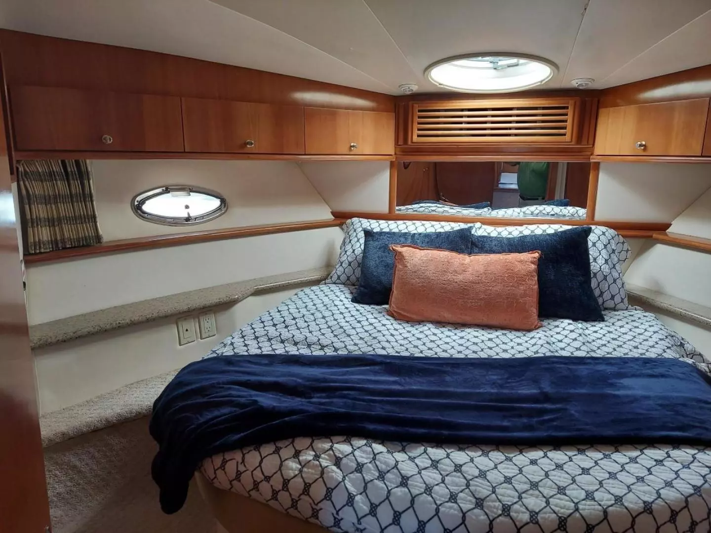 The Carver 466 has incredible living space comparable to 60-foot yachts. You'll be greeted by warm woodwork throughout the entire boat, plush leather seating, as well as granite counters in the kitchen, baths, and cabins. She has three cabins with queen births plus a love seat that pulls out to a single and a dinette that converts to a bed. This boat can comfortably sleep 9. There's ample storage space throughout the cabins and boat. A spacious galley kitchen complete with a full-size fridge and freezer, three burner cooktop, microwave, and built-in coffee maker with extensive storage cabinets. Long trips are made easy with a combo washer and dryer and central vacuum. A new davit system for your dinghy on the swim platform makes mooring out a breeze.