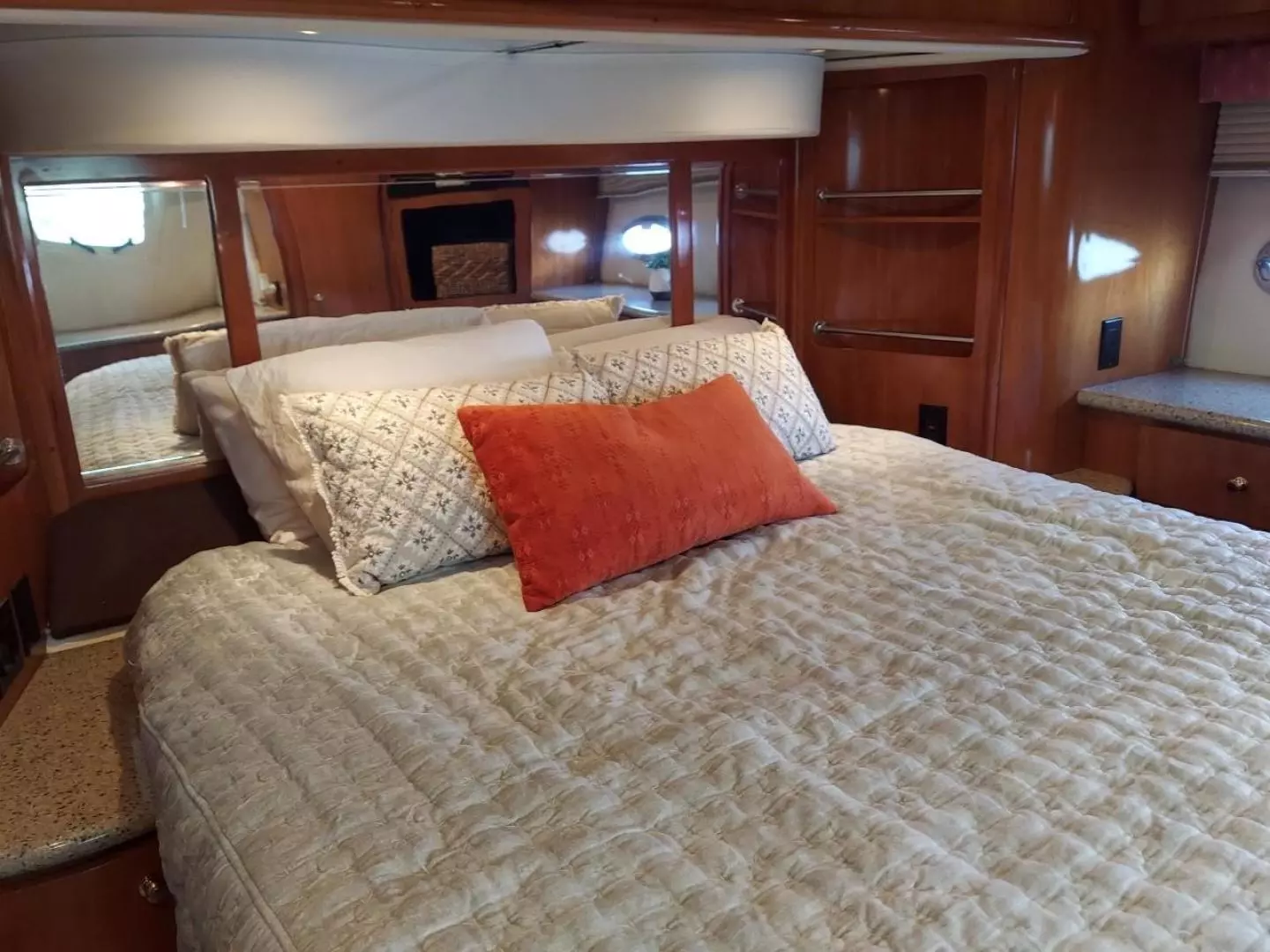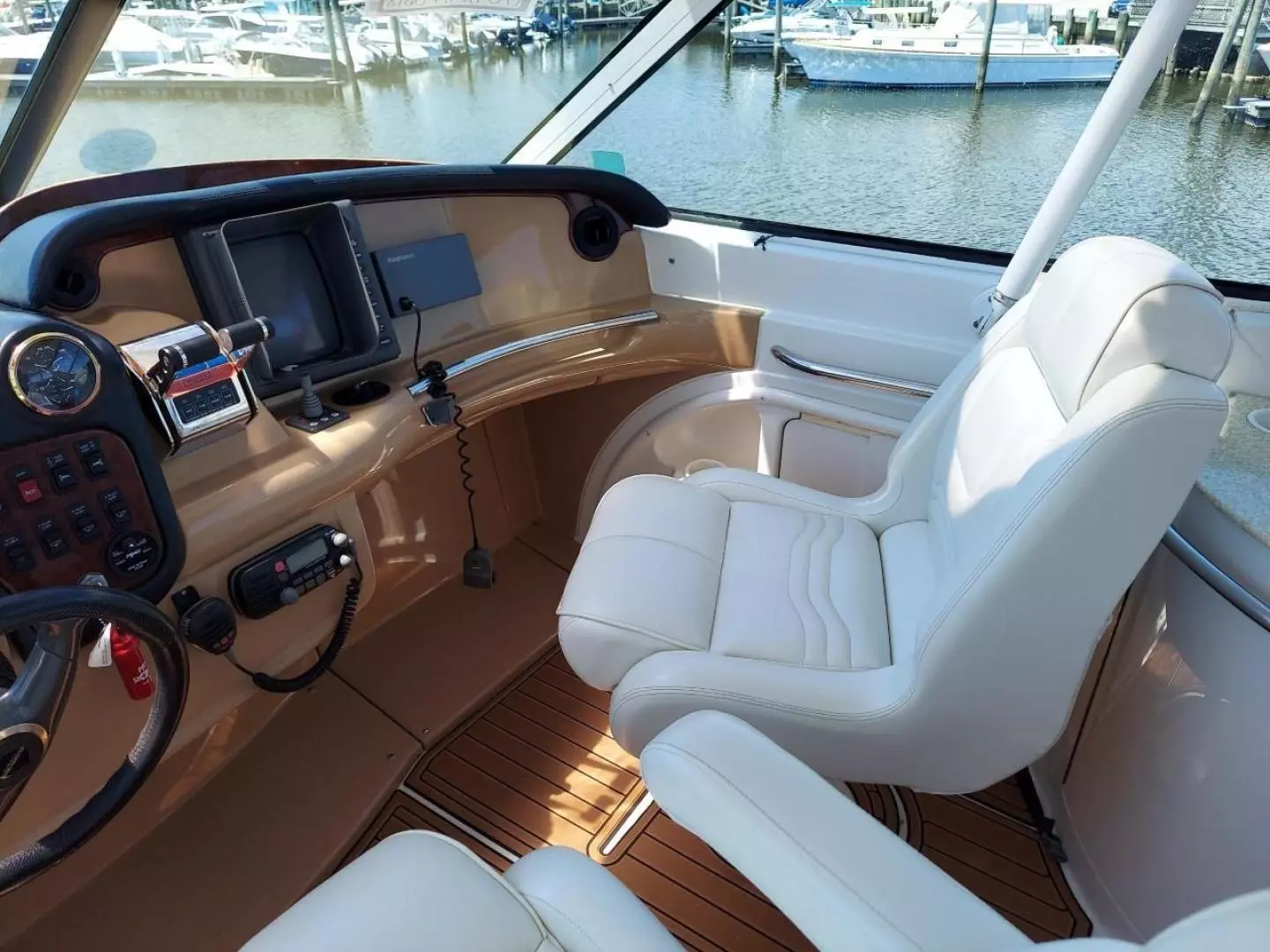 The VIP is forward with a centerline queen bed, ventilation hatch, hanging lockers port and starboard with storage beneath. Aft to starboard is the enclosed head with vanity, mirror and separate stall shower. Aft again is the third stateroom for kids with a queen mattress. Aft to port is the spacious galley area with all the amenities- amply counter, cabinet and drawer space. Up a couple of steps to the main salon with an L-shaped settee to starboard and a sofa the converts to port. Aft to port is the entertainment center. Forward to starboard is the dinette area and opposite the dinette is a bar with a couple of stools. Down a couple of steps to the master stateroom with a centerline queen bed, transom ventilation hatch, enclosed head to port with separate stall shower. Beautiful Cherry interior woodwork throughout. Up a couple of steps to the aft deck with a transom door, wet bar and wing doors to access your way forward to the bow. Up a few steps to the bridge deck with the center helm forward with 3 helm chairs, a wet bar area and a table with full seating.