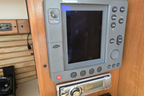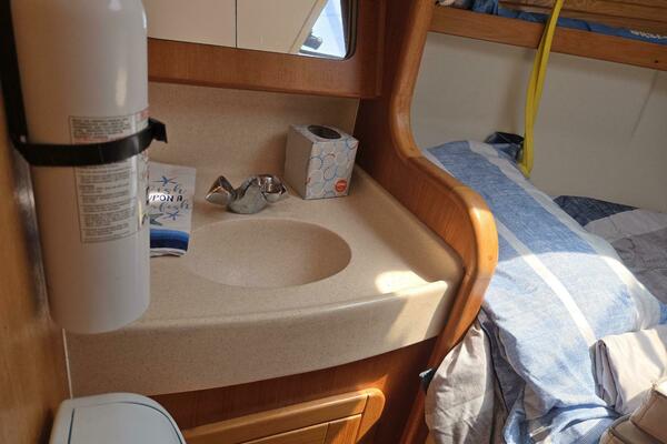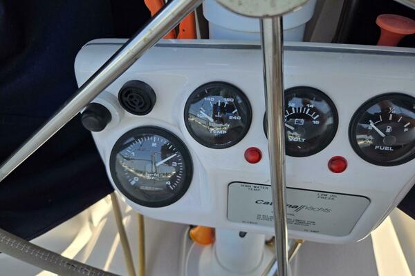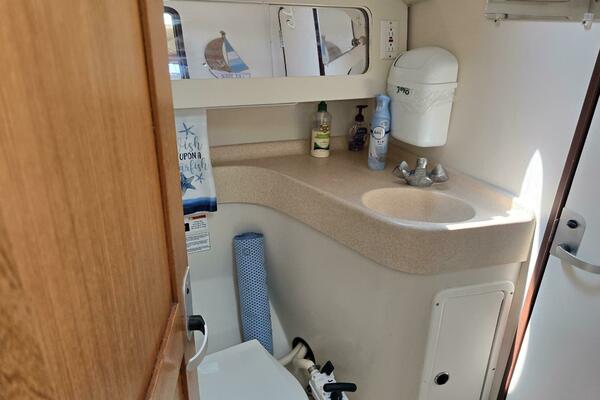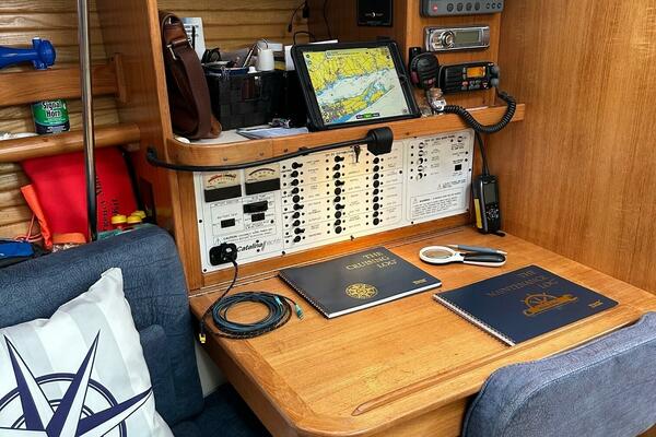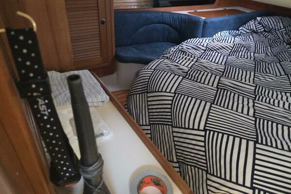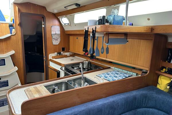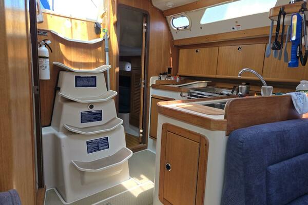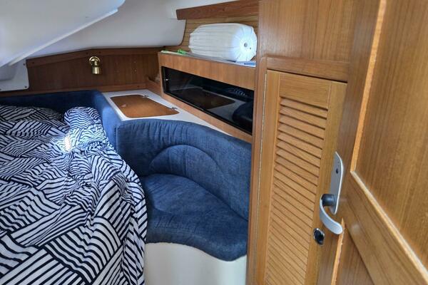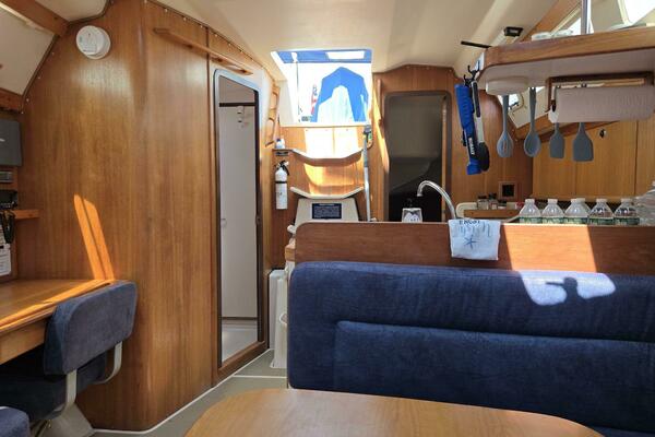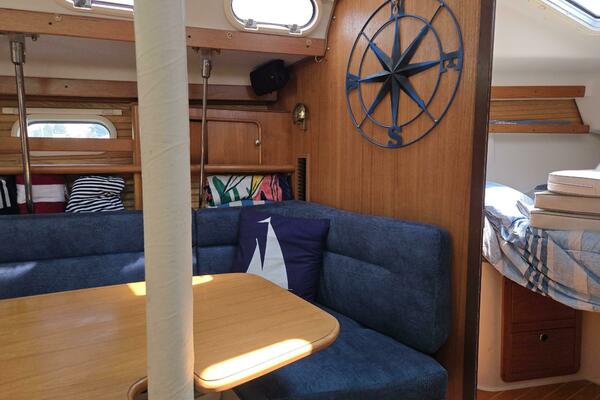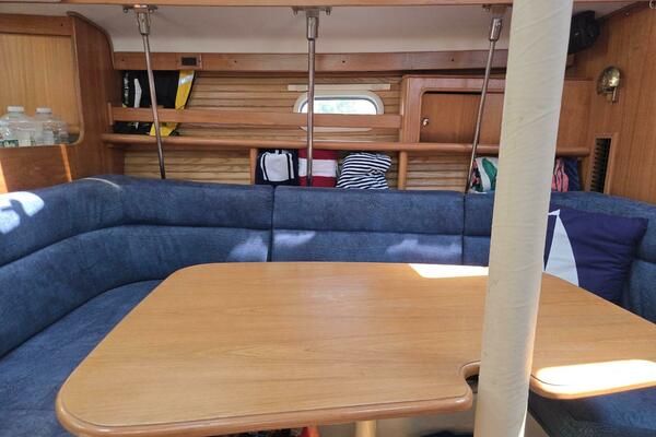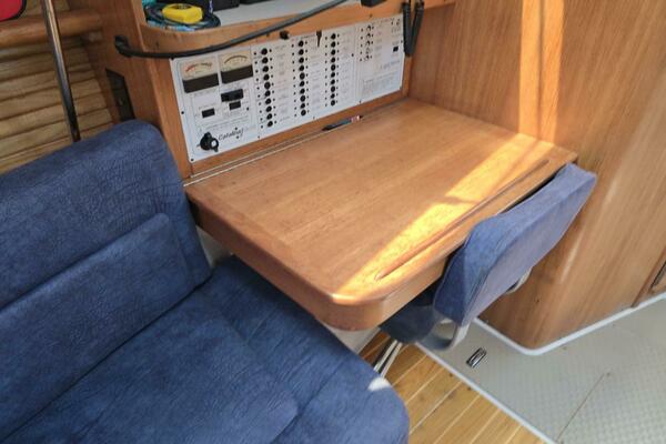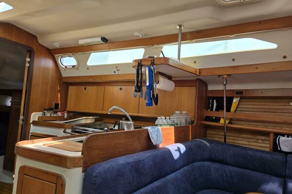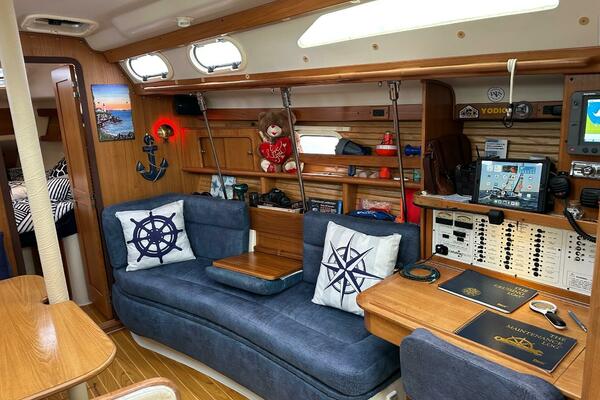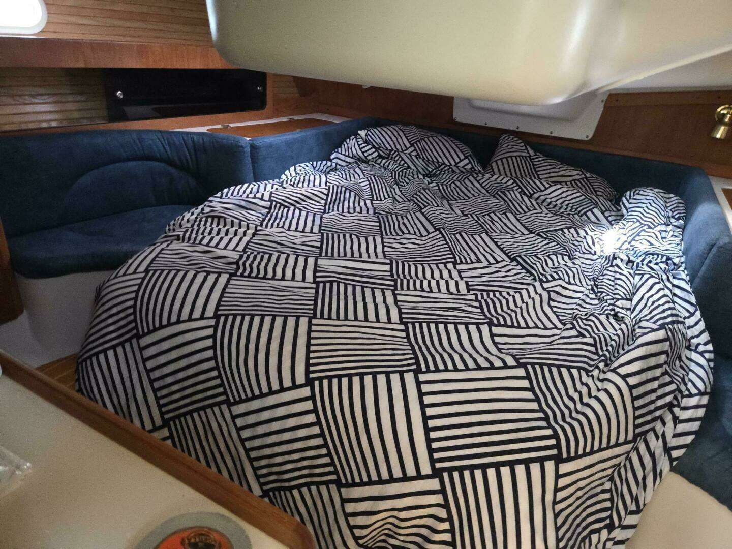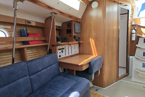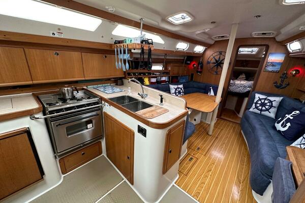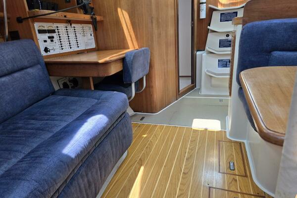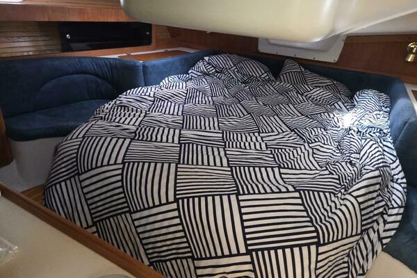 Forward you have a V-berth with a sink with vanity to port and a hanging locker to starboard. Aft to starboard you have a long settee where the center cushion folds down to make a table for cocktails. Aft again to starboard is the nav station and the enclosed head with separate stall shower. Aft to port is the dinette area with table that converts to a double bed. Aft again to port is the spacious galley area. Aft again to port is the master stateroom with a center line queen bed, seats port & starboard and access to the head. Up the steps to the cockpit area with U-shaped seating, pedestal wheel steering with table, full instrumentation and a transom ladder.