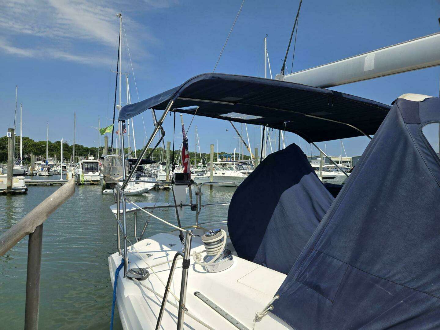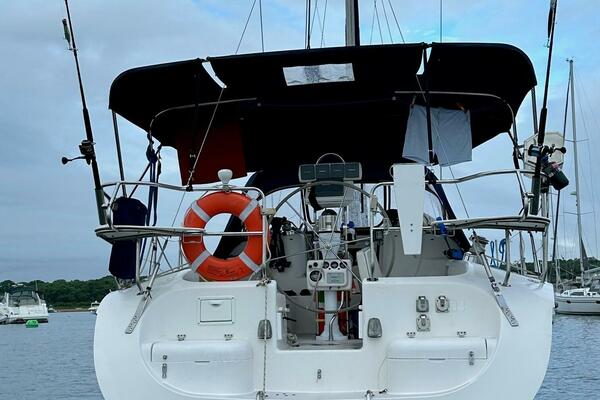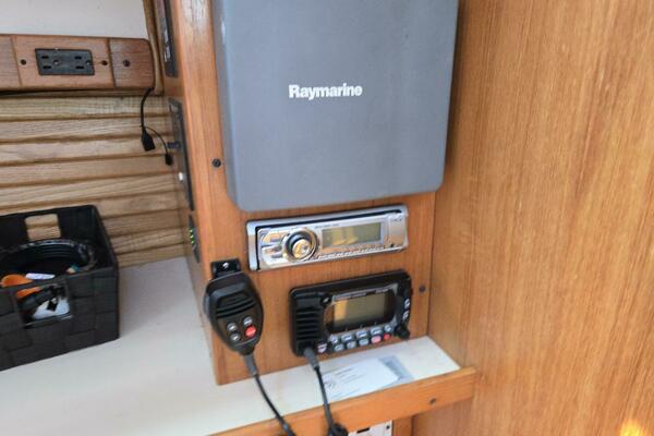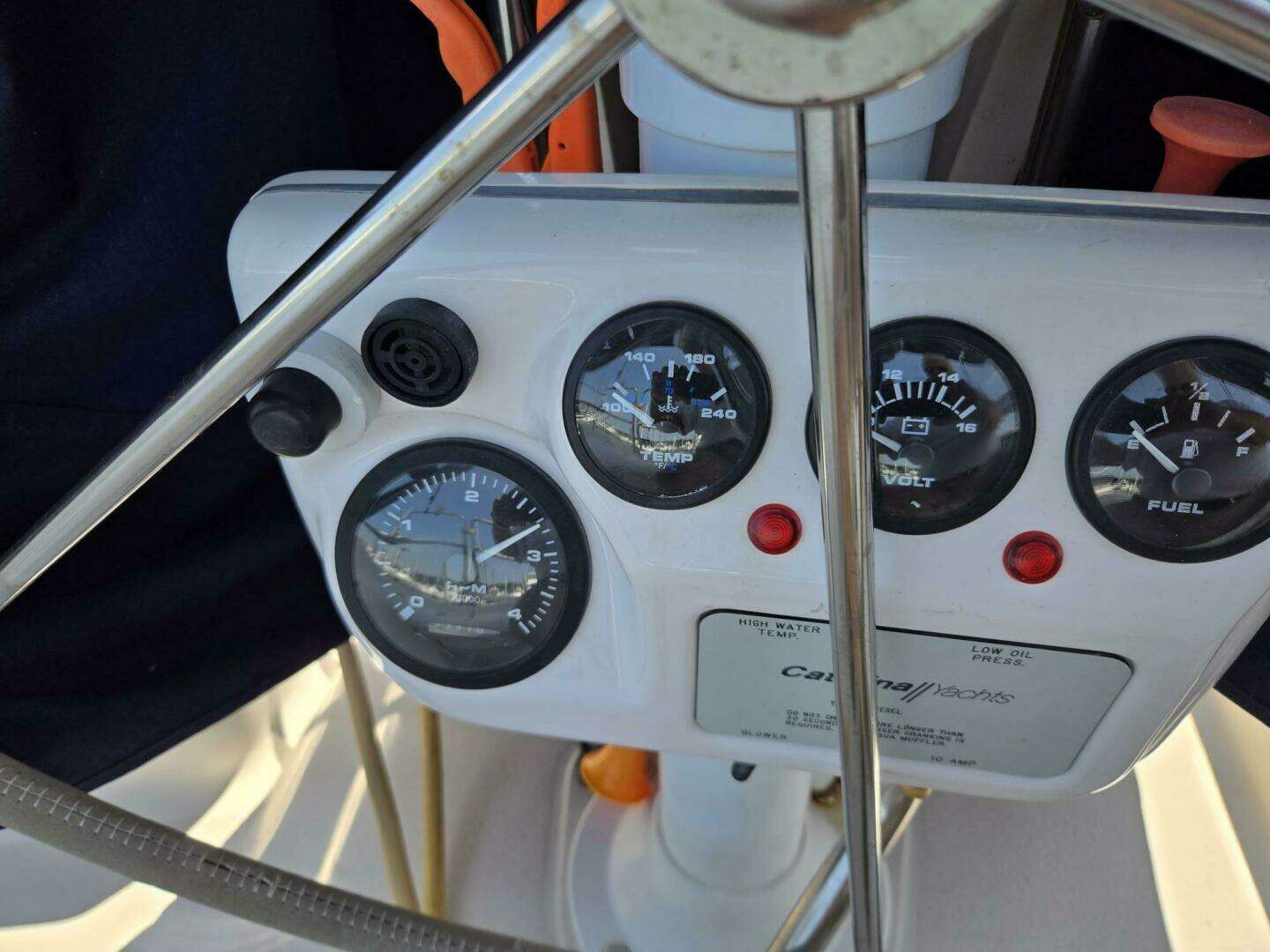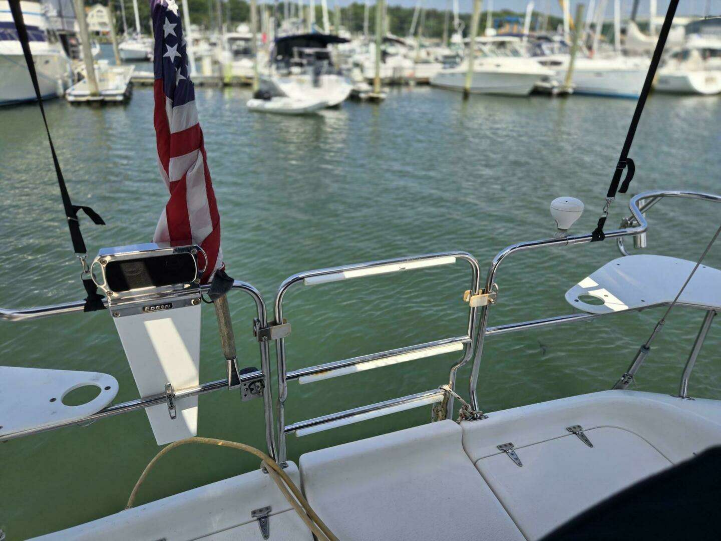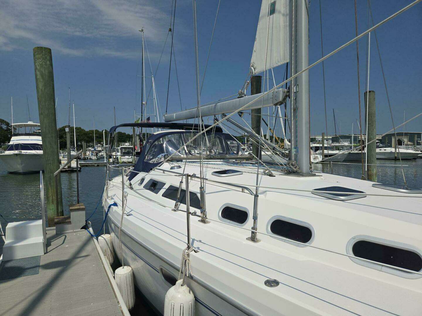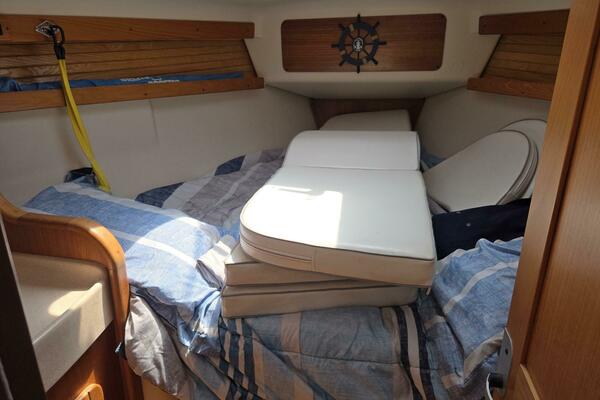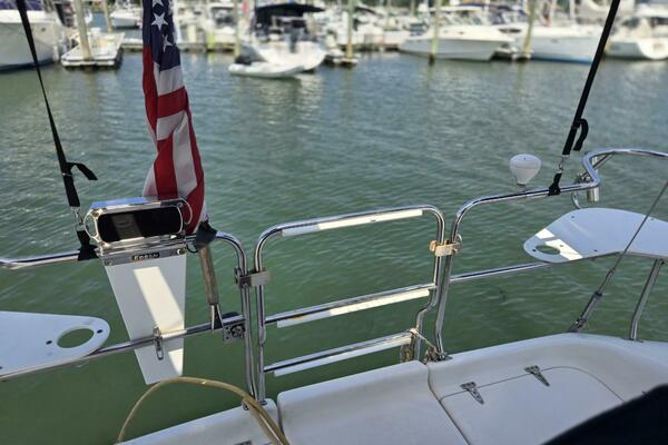 Forward you have a V-berth with a sink with vanity to port and a hanging locker to starboard. Aft to starboard you have a long settee where the center cushion folds down to make a table for cocktails. Aft again to starboard is the nav station and the enclosed head with separate stall shower. Aft to port is the dinette area with table that converts to a double bed. Aft again to port is the spacious galley area. Aft again to port is the master stateroom with a center line queen bed, seats port & starboard and access to the head. Up the steps to the cockpit area with U-shaped seating, pedestal wheel steering with table, full instrumentation and a transom ladder.