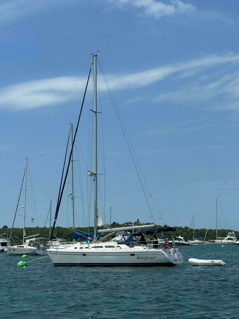 A 2001 Catalina 380 sailboat, like the "Fanfare," is a comfortable and well-equipped vessel known for its spacious layout and ease of handling, making it suitable for both cruising and racing. It typically features a large salon, a well-appointed galley and head, and a spacious aft stateroom with a queen-sized bed.