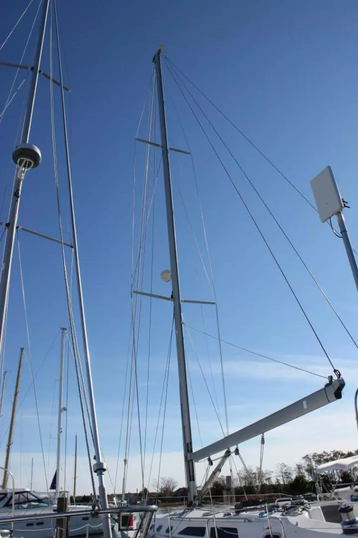 The challenges of extended offshore cruising have been met with a display of strength, innovative design, and engineering that clearly define the Catalina 470. A unique, structural fiberglass grid is bonded to the hull and provides both strength for the hull and a massive foundation for securing bulkheads, equipment, engine, and tanks. Below there is a new standard of functionality and comfort. The galley is remarkable in its amount of cold, consumables, and equipment space. The generous deck beam is carried well aft providing for an expansive cockpit with twin steering stations and large master stateroom below. The luxurious main salon boasts adjustable arm chairs and deep banquet seating available in soft, durable Ultraleather. The nav station contains all necessary readouts. For easy maintenance, centrally located equipment clusters offer easy access to all pumps, valves, and filters. At every turn, equipment and systems have been engineered to the most demanding bluewater specifications: the first ever articulated traveler rotates fore and aft, spreading the load evenly over bearing surfaces for smoother main sheet handling and more precise trimming. Custom cheek blocks and raised genoa tracks guide sheets straight aft to large, powerful winches. Moreover, a powerful, double spreader rig and generous sail plan are balanced to deliver a remarkable combination of high performance and ease of handling.