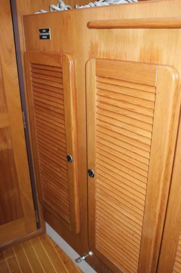 - Owners stateroom aft with queen size island berth, hanging lockers, drawers, vanity desk with seat and private entrance to aft head.