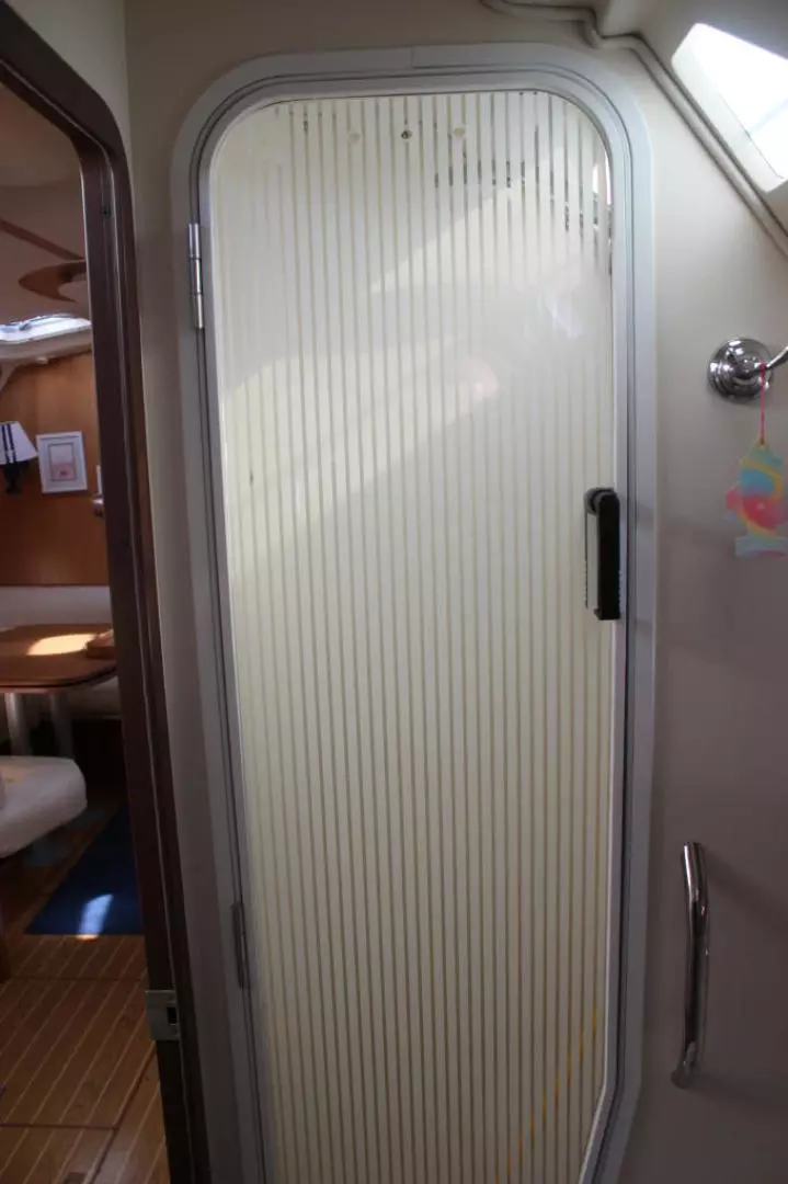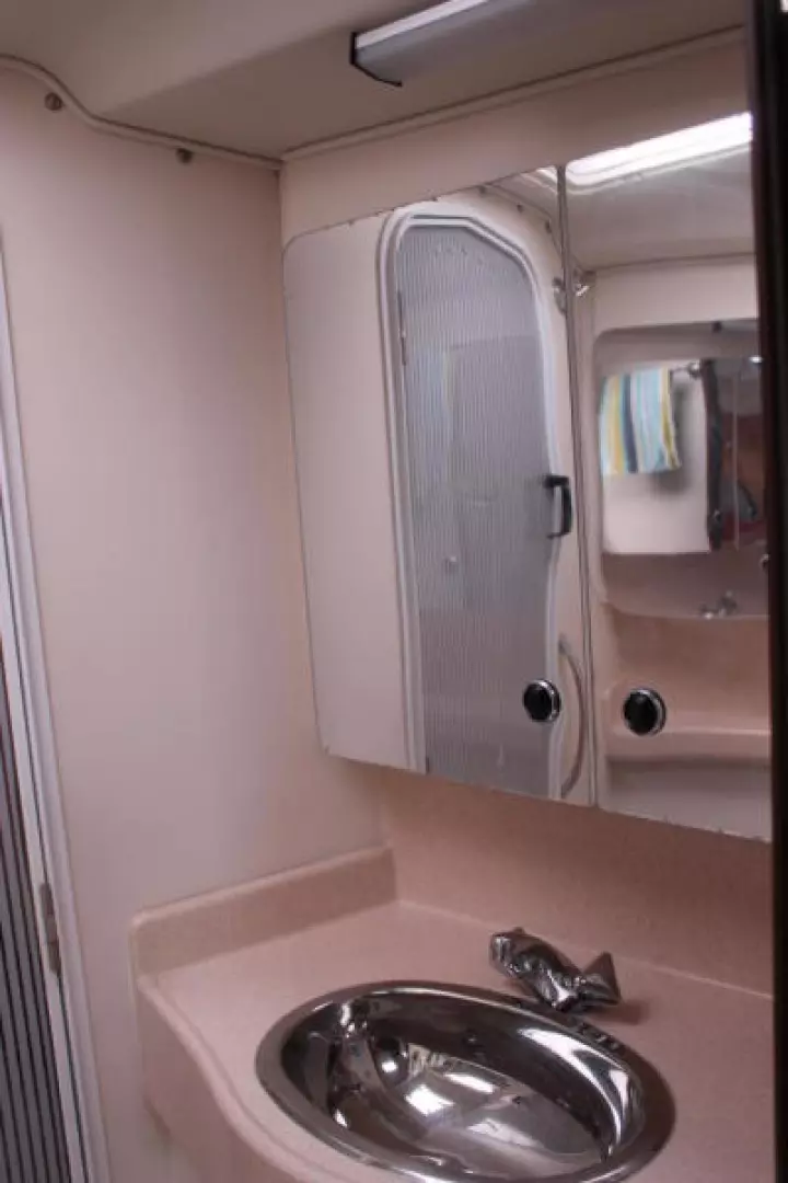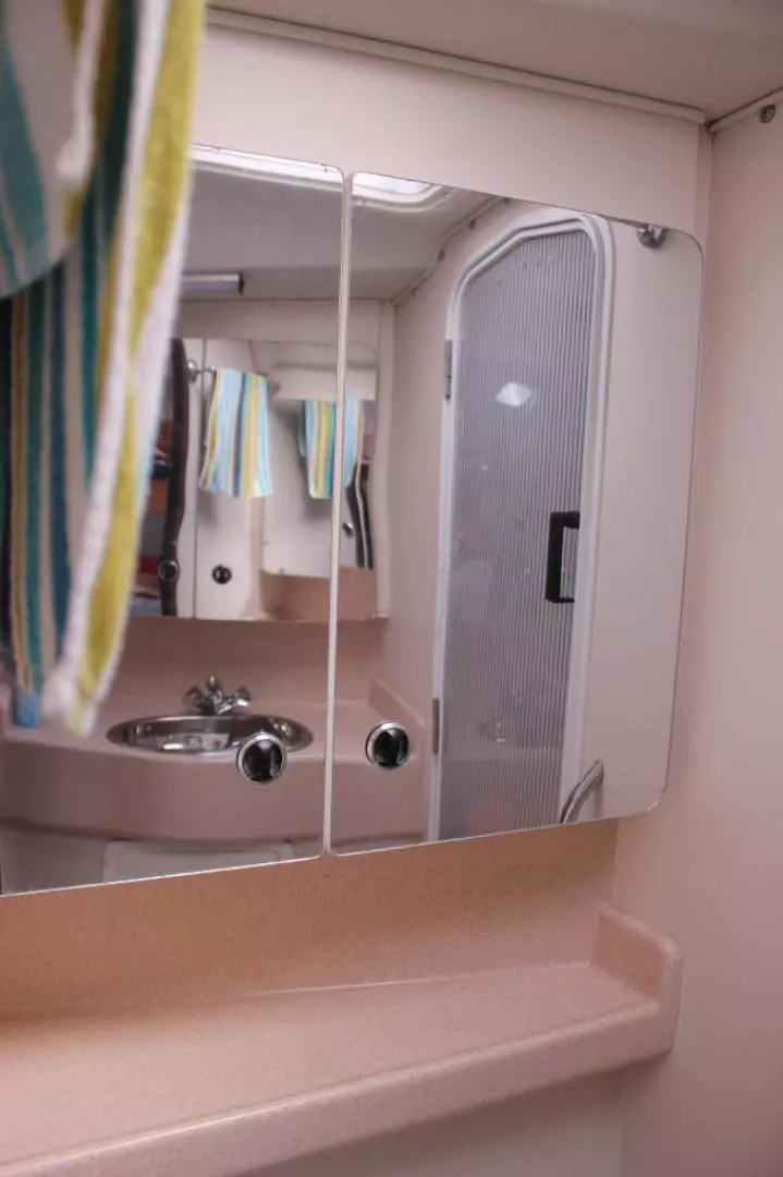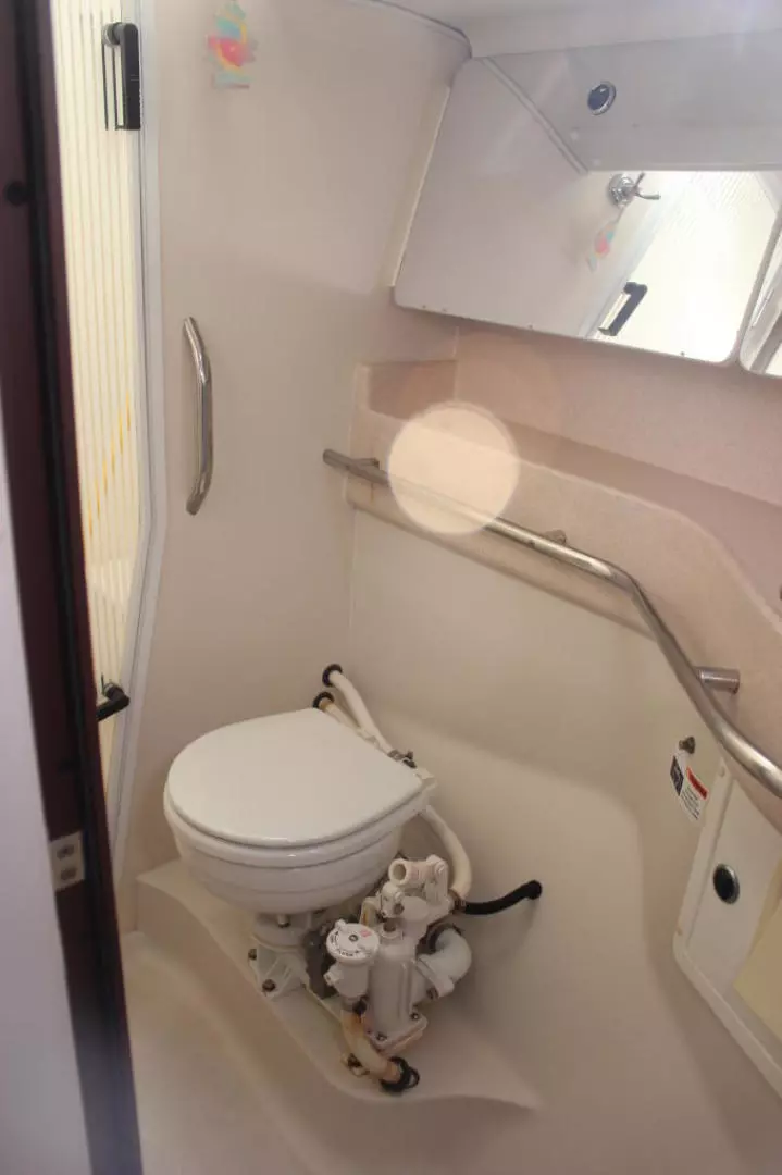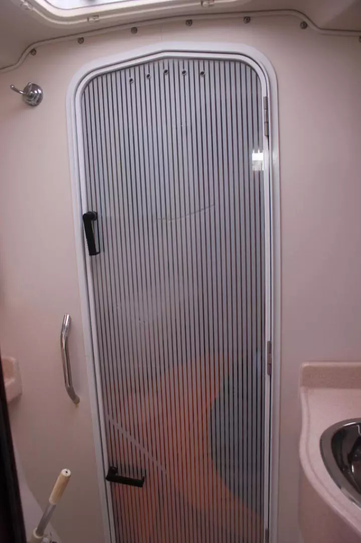 - Complete head compartment forward and aft with separate shower compartments. - Hot and cold deck shower at transom.