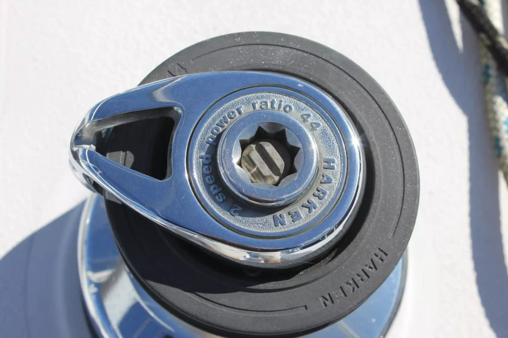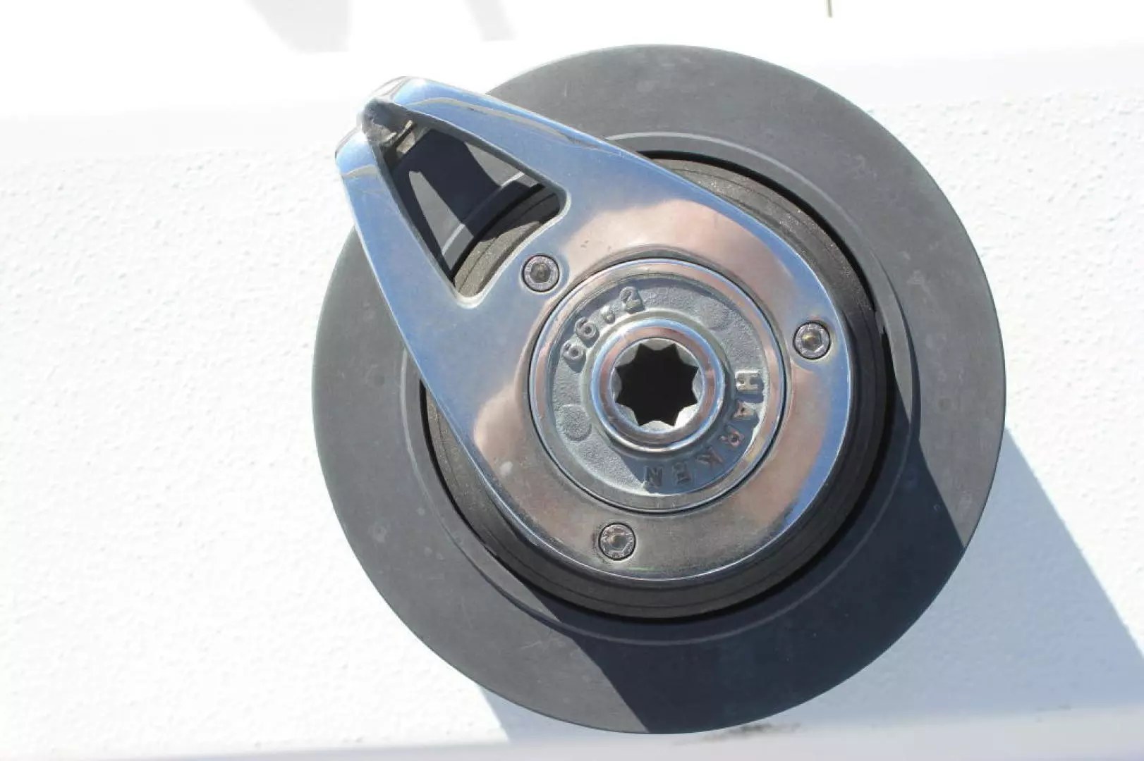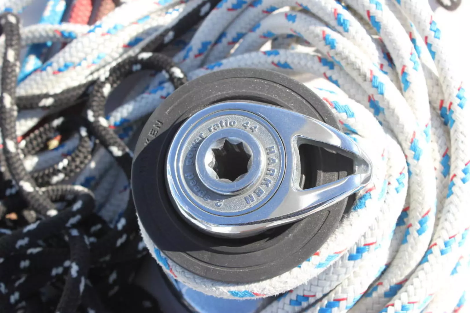 - Mainsheet traveler with car and multi-purchase adjuster system.