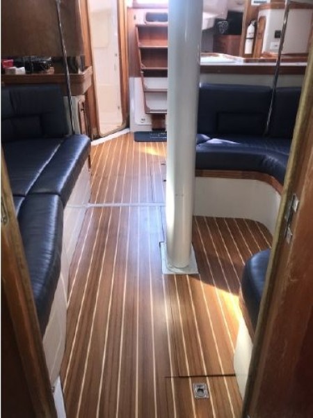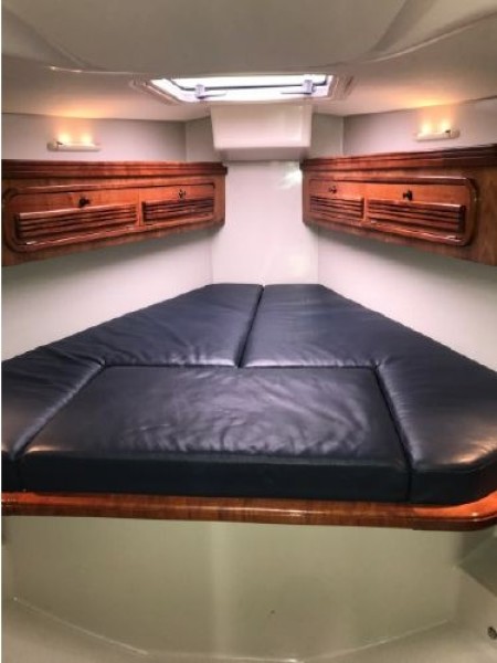 The main salon features an L-shaped settee to port and a straight settee to starboard, both in navy leather. Storage is provided outboard in lockers and shelving. There is also storage below the settees. There are two 110 AC outlets located on each side of the salon. LED Lightsand fixed ports, as well as ventilation provided three overhead hatches, one with a Day/Night Solar Vent installed in 2020. All interior upholstery and woodwork are in excellent condition.